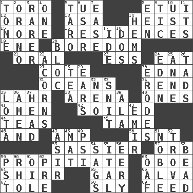 ACROSS 1. "Corrida" creature 5. Third day of the wk. 8. Needle holder 12. NW Algerian seaport 13. White ___ sheet 14. Robbery 15. Greater amount 16. Dwellings 19. Compass dir. 20. Mood resulting from idleness 21. Relating to the mouth 23. Double-curved letter 24. Consume 27. ____ d'Azur (French Riviera) 30. Pulitzer Prize-winning author Ferber 31. Seas 34. Tear apart 35. Cowardly lion portrayer 38. Sports stadium 40. Singles 41. Sign of something about to happen 42. Dirtied 44. Beverages made from leaves 45. Docile 46. Plus 47. Electrical Unit 50. Is not 53. More disrespectful 57. Globe 59. Appease 63. Mitch Miller's instrument 64. Bake eggs in their shells 65. Slender fish 66. Inventor's middle name 67. Lacquered or enameled metalware 68. Insidious 69. Nourish DOWN 1. Heavy book 2. U. of Maine site 3. More uncommon 4. Single 5. Edible starchy tuberous root 6. One who makes use of a thing 7. Comfort 8. Car or cant ending 9. Nervous spasm 10. Purpose 11. It is 14. Cloth borders 17. Binary compound 18. Two (Sp.) 20. Alliance 22. Oak nuts 24. Locale of original sin 25. Queen of England 1702-14 26. Small amounts or degrees 28. Beverage made from leaves 29. Hearing organs 30. Eats (away) 32. Modern: prefix 33. In a ____ (agitated or irritated) 35. Globular water bottle used in Asia 36. So be it 37. Froth on beer 39. According to 43. Independent ruler or chieftain 47. SW Saudi Arabia district 48. Floor covering 49. 23rd letter of the Greek alphabet 51. Having high moral qualities 52. Collection of objects 54. Sinks 55. Slanted text style (abbr.) 56. Suggestive of the supernatural 58. Necklace unit 59. Pacific Standard Time (abbr.) 60. 17th letter of the Greek alphabet 61. Lubricate 62. Before (prefix) 63. Clumsy lout