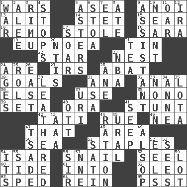 ACROSS 1. Armed conflicts 5. Toward the sea 9. Mine, in Marseilles 13. Came down and settled, as after flight 14. Proofreading order 15. Dry up 16. San ____ (Riviera town) 17. Took without asking 18. "Two Mules for Sister ____" 19. Normal relaxed breathing 21. Shallow baking pan 22. Play the lead 23. A home for chicks 24. "We ___ not amused" (Victoria) 27. Big collection agency 28. Blind as ____ 29. Purposes of endeavors 31. Santa ___, CA 32. Of or related to the anus 36. Otherwise 37. Purpose 38. Words to Nanette 39. Stalk of a moss capsule 40. Mouth or opening 41. Difficult or unusual or dangerous feat 42. Jacques of French films 44. Regret 46. Teachers' org. 47. Not this but _ 48. Type of rug 50. Ocean 51. Paper fasteners 54. Austrian river, tributary to the Danube 56. Slow-paced one 58. Stitch closed the eyes of (a falcon) 60. Periodic rise and fall of the sea level 61. To the inside or interior of 62. Margarine 63. Hurried 64. It's straight from the horse's mouth 65. Inconspicuous attention getter DOWN 1. Armed conflict 2. Toward shelter 3. Tall New Zealand timber tree 4. Obstructs or blocks passage 5. Michaelmas daisies 6. Portico 7. Snakelike fish 8. Had dinner 9. Aide 10. Intended 11. Boat paddle 12. Lyricist Gershwin 17. Fly high 20. Nuclear Threat Initiatives 21. Beverage made from leaves 23. Basketball assoc. 24. Matures 25. Hero or heavy, e.g. 26. Compass direction 28. One (Scot) 30. Resembling or made to resemble leather 31. White ___ sheet 33. Part of speech 34. Singer Murray 35. Globular water bottle used in Asia 37. RI univ. 40. Baseball player Mel 41. Ooze 43. American Automobile Association (abbr.) 44. Food allowance for one day 45. Mountain range 47. Sadhe (variant) 49. Columnist Joseph or Stewart 51. Suttee (variant) 52. Snakelike fish 53. Observes 54. It is 55. Small drink 56. Title for a knight 57. Compass dir. 59. Car dealer's back yard