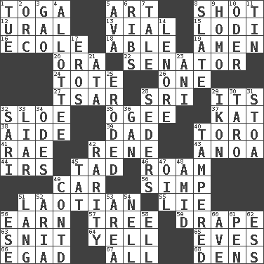 ACROSS 1. Ancient Roman robe 5. Tate display 8. Attempt 12. Mountain range 13. Small bottle 15. Farming town in central California 16. Learning spot: Fr. 18. Competent 19. So be it 20. Mouth or opening 22. Elected representative 24. Haul 26. Single 27. Russian ruler of old 28. _ Lanka 29. ___ a Wonderful Life 32. A type of plum 35. Double curve, resembling the letter S 37. Krazy ___ of comics 38. Helper 39. Male parent 40. "Corrida" creature 41. Actress Charlotte 42. French philosopher Descartes 43. Small Philippine buffalo 44. Big collection agency 45. Small amount or degree 46. Wander 49. Automobile 50. Simple or foolish person 51. Of or relating to Laos or its people 55. Untruth 56. Merit 57. Family _ (genealogy) 59. Window treatment 63. In a ____ (agitated or irritated) 64. Shout 65. Nights before holidays 66. Mild oath 67. Everything 68. Lairs DOWN 1. Third day of the wk. 2. The grampus (Milton) 3. E Mali city 4. One to whom something is allotted 5. Actress Gardner 6. Chest bones 7. Falsehood 8. Chalkboard 9. Like (prefix) 10. River in Europe 11. Shallow baking pan 14. Poe poem 17. Greek god of love 21. "One Day ___ Time" 23. Cuckoo 25. Worn away 28. Spring feasts 29. Visual representation of an object 30. Edible starchy tuberous root 31. Portico 32. Indian skirt 33. One who doesn't tell the truth 34. Lyric poems 36. Separate the seeds from cotton 40. ________ with (broke a safety seal) 42. Noteworthy scarcity 45. Make lace 47. Petroleum 48. Among 49. Continued (abbr.) 51. Austrian-born American filmmaker Fritz 52. Operatic vocal solo 53. Type of rug 54. 1994 drama film starring Jodie Foster 56. Compass dir. 58. Pipe bend 60. "___ Maria" 61. Animal enclosure 62. Double-curved letter