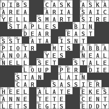 ACROSS 1. Claim 5. Keg 9. "____ silly question..." 13. Length times width 14. Roberta Peters solo 15. Ketch in the Levant 16. Shout 17. Don Adams' spy role 18. Title for a man of rank and authority 19. Paper fasteners 21. Storage container 22. Letter starter 23. Compass direction 24. Fast jet (abbr.) 27. _ moment's notice (2 wds.) 28. Is not 29. Peter (Polish) 31. Mountains (abbr.) 32. Swedish rock group 36. Small Philippine buffalo 37. Affirmative reply 38. Actress Patricia 39. 1994 drama film starring Jodie Foster 40. Arrange properly for use 41. Having lost freshness 42. Central Nebraska county 44. For each 46. Expire 47. Comedian Laurel of Laurel & Hardy 48. (Had) reclined 50. Auto 51. More lively and spirited 54. The bottom of a shoe or boot 56. Having winglike extensions 58. Makes supply last 60. Singer Murray 61. Wig 62. Penny 63. Allows 64. The front part of a cuirass 65. Whirlpool DOWN 1. 24 hours 2. Angers 3. Waist strap 4. Vegetable dish 5. Device for capturing images 6. Ancient river in northeast Turkey 7. Title for a knight 8. Krazy ___ of comics 9. Aide 10. Virtuous person 11. Apertif with cassis 12. Adept person 17. Narrow board 20. Lightbulb-shaped fruit 21. Prohibit 23. Double-curved letter 24. Connect, as a bridge 25. Trig term 26. Utensil 28. ___ a Wonderful Life 30. Baron Munchausen's specialties 31. Was introduced to 33. Necklace unit 34. Indonesian resort city 35. Toward shelter 37. Slangy assent 40. Player for Phoenix 41. Indian titles of respect 43. Rowing implement 44. Food holders 45. Comfort 47. Aroma 49. Sibling's daughter 51. Suttee (variant) 52. Supplemented with great effort 53. Tear apart 54. Actor Linden 55. Compass dir. 56. Had dinner 57. Part of a journey 59. Filthy place