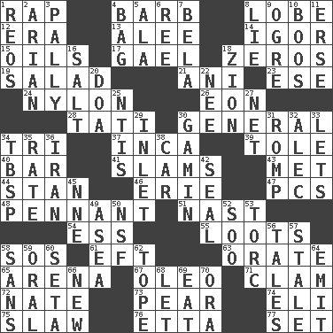 ACROSS 1. Strike 4. Sharp remark 8. Ear part 12. Period 13. Toward shelter 14. Composer Stravinsky 15. Petroleums 17. Highlander 18. Nothings 19. Vegetable dish 21. Black tropical American cuckoo 23. Compass dir. 24. High-strength synthetic material 26. Period of immesurable duration 28. Jacques of French films 30. Commissioned military rank 34. Three (prefix) 37. South American Indian 39. Lacquered or enameled metalware 40. Long, evenly shaped piece 41. Shuts with force 43. Was introduced to 44. Comedian Laurel of Laurel & Hardy 46. One of the Great Lakes 47. Personal Computers (abbr.) 48. Pre-World Series prize 51. Political cartoonist Thomas 54. Curvy letter 55. Plunders 58. Mayday 61. Newt 63. Speak pompously 65. Sports stadium 67. Butter sub 71. Dollar (slang) 72. Nathan's nickname 73. Lightbulb-shaped fruit 74. Biblical high priest 75. Cole _ (cabbage dish) 76. Singer James 77. Put into a specified state DOWN 1. Vintage cars 2. Believer in; advocate of (suffix) 3. Friendly 4. Paper or plastic container 5. According to 6. Portuguese money of account (variant) 7. Actor Lugosi 8. Untruth 9. Legendary monster 10. Expressions of contempt or scorn 11. Celtic language 16. Table seasoning 18. The Jewish people; Israel 20. ___ good deed 22. Born 25. Nuclear Threat Initiatives 27. Fish or hair follower 29. An arm off of a larger body of water 30. Street urchin 31. Frolic 32. Actor Baldwin 33. Allows 34. Cook's measure (abbr.) 35. Pace 36. SW Asia republic 38. Automobile 42. Lick closed 45. Compass dir. 49. Toward the sea 50. Overdraft (abbr.) 52. "Barney Miller" actor Jack 53. Torque (variant) 56. Stories 57. Having lost freshness 58. Without 59. Taken by mouth 60. Bristle 62. Drink excessively 64. Give off 66. ___ Haven, CT 68. Allow 69. Ingest 70. Mouth or opening