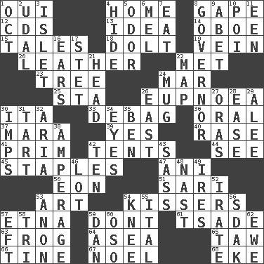 ACROSS 1. Fr. "Yes" 4. Dwelling 8. Open wide 12. Music discs 13. The content of cognition 14. Mitch Miller's instrument 15. Falsehoods 18. Stupid person 19. Distinctive style or manner 20. Cordwainer's material 22. Was introduced to 23. Relationship diagram 24. Third mo. 25. R.R. building 26. Normal relaxed breathing 30. Call ___ day 33. Debunk (Brit. slang) 36. Spoken 37. Hindu Mythology: god of death 39. It is so 40. To erase 41. Demure 42. Portable shelters 44. Observe 45. Paper fasteners 47. Black tropical American cuckoo 50. Period of immesurable duration 51. Indian skirt 53. Tate display 54. Smoochers 57. Inactive volcano in Sicily 59. Do not 61. Sadhe (variant) 63. Toadlike animal 64. At sea 65. The 23rd letter of the Hebrew alphabet 66. Prong on a fork 67. Christmas carol 68. Supplement with great effort DOWN 1. Sep. follower 2. Hereditary estate 3. Small island 4. Flintstone garb 5. Aroma 6. Cartoonist voice _ Blanc 7. Consume 8. State head 9. Collude with 10. Luau course 11. Car or cant ending 16. Hearing organs 17. Proofreading order 21. Froth on beer 22. Atlas unit 24. Large cup 26. 90 degrees 27. Mouths or openings 28. Comfort 29. Toward shelter 30. Naughty children 31. Small pie 32. Roberta Peters solo 34. Sight organs 35. Benjamin's nick name 38. Electrical Measurement 42. "___ Little Indians" 43. Backtalk 46. Car dealer's back yard 48. Political cartoonist Thomas 49. Angers 52. Feeling or showing extreme anger 53. Soon (poet.) 54. Leg joint 55. Slanted text style (abbr.) 56. Neighbor of Neb. 57. Bank Draft (abbr.) 58. Three (prefix) 59. Daniel's nick name 60. Bear (Spanish) 62. She-sheep