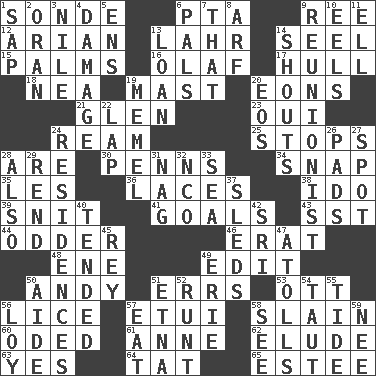 ACROSS 1. Something which is sent 6. Parent Teacher Association (abbr.) 9. To sift 12. Believer in; advocate of (suffix) 13. Cowardly lion portrayer 14. Stitch closed the eyes of (a falcon) 15. Insides of hands 16. Norwegian king 17. Frame or body of a ship 18. Teachers' org. 19. Vertical spar for supporting sails 20. Immeasurably long periods of time 21. Small, secluded valley 23. Fr. "Yes" 24. 480, 500 or 516 sheets of paper 25. Ceases 28. "We ___ not amused" (Victoria) 30. Actor Sean's family 34. Fastener 35. French article 36. Shoestrings 38. Wedding promise 39. In a ____ (agitated or irritated) 41. Purposes of endeavors 43. Fast jet (abbr.) 44. More peculiar 46. Part of Q.E.F. 48. Compass dir. 49. Prepare for publication 50. Actor Griffith 51. Blunders 53. Baseball player Mel 56. Louse (plural) 57. Needle holder 58. Killed 60. Wrote a lyric poem 61. Singer Murray 62. Dodge 63. Affirmative reply 64. Make lace 65. First name in cosmetics DOWN 1. Plant excrement 2. Northwest Algerian city 3. The longest river in the world 4. Break 5. Followers of ems 6. Friends 7. Not this but _ 8. Sandy's bark 9. One who advocates reunion 10. Snakelike fish 11. Pipe bend 13. Grant temporary use of 14. Yells 19. Klaipeda city 20. Greek goddess of the dawn 22. Pet locale 24. Dwellings 26. Groovy apts. 27. Blemish 28. In addition 29. Tear apart 31. Tired old horse 32. Non-commissioned officer (abbr.) 33. Ocean 37. Bobsleighs 40. Watched over 42. _ Lanka 45. Marina Del _, California 47. Ringlike coral islands and reefs 49. One of the Great Lakes 50. Helper 51. Inactive volcano in Sicily 52. The smallest animal of a litter 54. Strained 55. Event that recurs at intervals 56. Myrna of the movies 57. Consume 58. Perceive with the eye 59. Born