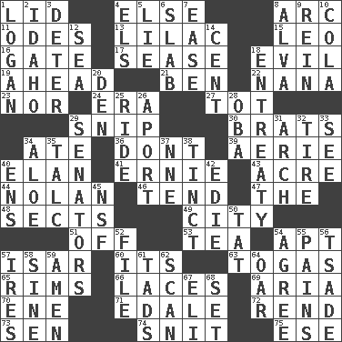 ACROSS 1. Hat (slang) 4. Otherwise 8. Curve 11. Lyric poems 13. Pale purple color 15. Lion 16. Yard entry 17. Gospel singer Marvin 18. Tending to cause great harm 19. At or in the front 21. Benjamin's nick name 22. Nanny 23. Not either 24. Epoch 27. Small child 29. Clip 30. Naughty children 34. Had dinner 36. Do not 39. Nest on high 40. Enthusiasm 41. Bert's buddy 43. 1/640 square mile 44. Pitcher Ryan 46. Watch over 47. Definite Article 48. Religious groups 49. Municipality 51. Below a satisfactory level 53. Beverage made from leaves 54. Fitting 57. Austrian river, tributary to the Danube 60. It is 63. Ancient Roman robes 65. Basketball hoops 66. Shoestrings 69. Operatic vocal solo 70. Compass dir. 71. Peak District village in England 72. Tear apart 73. Elected rep. 74. In a ____ (agitated or irritated) 75. Compass dir. DOWN 1. Utah city north of Ogden 2. Potato state 3. Prevent from occurring 4. Raised railways 5. Falsehood 6. Broad, flat, thick piece 7. Relaxation 8. Inventor's middle name 9. It's straight from the horse's mouth 10. Root beer relative 12. Ocean 14. Penny 18. Plea 20. Lair 25. Travel on an animal 26. To the left, to Queeg 28. Chief or king in Benin or Nigeria 29. Legislators 31. Bowlike part 32. Become fatigued 33. Observe 34. _ vera 35. Baby powder 37. Compass dir. 38. Tinged 40. Followers of ems 42. Singer Brickell 45. Science/research agcy. 50. Make lace 52. Do some clerical work 54. Match 55. Aches 56. Sadhe (variant) 57. Angers 58. Trig term 59. So be it 61. Small boys 62. Skim 64. Boat paddle 67. Connecticut Ivy Leaguer 68. Arrange properly for use
