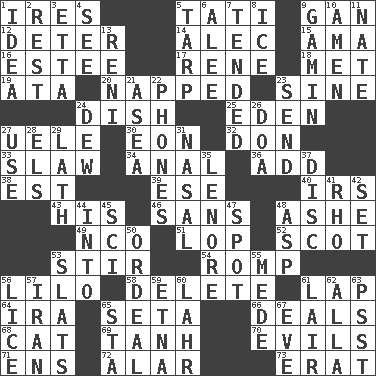 ACROSS 1. Angers 5. Jacques of French films 9. Separate the seeds from cotton 12. Prevent from occurring 14. Actor Baldwin 15. Housemaid (var.) 16. First name in cosmetics 17. French philosopher Descartes 18. Was introduced to 19. _ moment's notice (2 wds.) 20. Slept 23. Trig term 24. Food container 25. Locale of original sin 27. Ubangi River tributary 30. Period of immesurable duration 32. Spanish title 33. Cole _ (cabbage dish) 34. Of or related to the anus 36. Find the sum of 38. Eastern Standard Time (abbr.) 39. Compass dir. 40. Big collection agency 43. Part of HMS, perhaps 46. Without 48. American tennis player Robert 49. Non-commissioned officer (abbr.) 51. Trim (branches) 52. Native of Scotland 53. Agitate 54. Play 56. _ and Stitch 58. Keyboard key 61. Infant locale 64. Lyricist Gershwin 65. Bristle 66. Allots cards 68. Domesticated feline 69. Hyperbolic tangent 70. Vices 71. Followers of ems 72. Having or resembling wings 73. Part of Q.E.F. DOWN 1. The main thing one is thinking about 2. Repose 3. Singer James 4. Observe 5. Canvas cover 6. Toward shelter 7. Looked after 8. Frozen water 9. Street urchin 10. So be it 11. Nathan's nickname 13. Painter Guido (1575-1642) 21. At sea 22. Gives a jingle 23. Post 24. Morning condensation 26. ___ good deed 27. Purpose 28. Raised railways 29. Thin strip of wood or metal 31. Rhinal 35. Poe poem 37. Plate 41. 17th letter of the Greek alphabet 42. Put into a specified state 44. To the inside or interior of 45. _-fi 47. Blemish 48. Cleo's killer 50. Severe or trying experience 53. Narrow boards 55. Ancient Persian 56. Louse (plural) 57. SW Asia republic 59. Inactive volcano in Sicily 60. Cowardly lion portrayer 61. Den 62. Silent film actress Nazimova 63. Inconspicuous attention getter 65. R.R. building 67. First lady