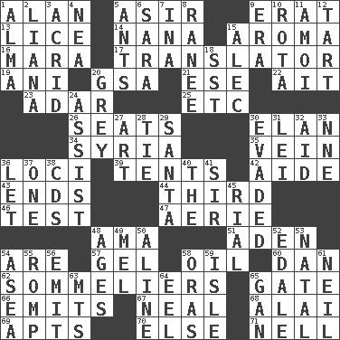 ACROSS 1. Actor Alda or Thicke 5. SW Saudi Arabia district 9. Part of Q.E.F. 13. Louse (plural) 14. Grandmother 15. Scent 16. Hindu Mythology: god of death 17. Interpreter 19. Cuckoo 20. Girls' org. (abbr.) 21. Compass dir. 22. Small island 23. The sixth month of the Jewish calendar 25. And so on (abbr.) 26. Theater features 30. Style 34. Damascus' land 35. Distinctive style or manner 36. Locales 39. Portable shelters 42. Helper 43. Extremities 44. One of three equal parts 46. Trial 47. Nest on high 48. Nursemaid (var.) 51. Arabian gulf 54. "We ___ not amused" (Victoria) 57. Set 58. Lubricate 60. Daniel's nick name 62. Wine waiters 65. Yard entry 66. Sends forth 67. Be tempered by heat 68. Mountain range southwest of Kyrgyzstan 69. Flats, for short 70. Otherwise 71. 1994 drama film starring Jodie Foster DOWN 1. _ mater 2. Woody, climbing, usually tropical plant 3. Sour-tasting 4. Teachers' org. 5. Pismires 6. "Two Mules for Sister ____" 7. _ tizzy (2 wds.) 8. Indian princess (variant) 9. Period 10. Roll call or roster of names 11. Mine, in Marseilles 12. Small pie 15. Actor Baldwin 18. Fast jet (abbr.) 20. Jennifer or Joel 24. Aid 27. Nonscientific branch of learning 28. Make a knot 29. Before Barbara or Clara 30. Dodged 31. Flowery wreath 32. Help 33. Compass dir. 36. Allow 37. Single 38. Music discs 40. Definite Article 41. Title for a knight 45. Monetary unit of Yemen 48. Ripens 49. Cartoonist voice _ Blanc 50. Place in a line 52. Peak District village in England 53. Relating to or accompanying birth 54. At sea 55. Frolic 56. Send forth 58. Mouths or openings 59. Capri or Wright 61. Famous astronaut Armstrong 63. Mountains (abbr.) 64. Snakelike fish 65. Separate the seeds from cotton