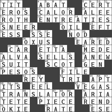 ACROSS 1. Teat (slang) 4. Blind as ____ 8. An absolute certainty 12. Greek god of love 14. Bodily heat indicating an inflammation 16. Toward shelter 17. Writer of Portnoy's Complaint (1969) 18. Pleas 20. Contemptuous expression 22. Lubricate 23. Bank Draft (abbr.) 24. Curvy letter 25. Compass dir. 28. Lower and raise head in agreement 30. The longest river in Central Asia 31. Having ears or earlike features 35. 4-wheeled motor vehicle 37. Singer James 40. Ancient Persian 41. Inventor's middle name 42. Makes a sale 44. Afresh 45. Set or collection 46. Native of Scotland 47. Commissioned mil. rank 48. Mexican monetary units 50. Do some clerical work 52. Marina Del _, California 54. Three (prefix) 55. Fitting 58. ___ a Wonderful Life 61. Snakelike fish 63. Viva Las _ 65. Interpreter 70. Operatic vocal solo 71. Wig 72. Part 73. Tear apart 74. Migrant worker of the '30s 75. Pace 76. Compass dir. DOWN 1. Laconic 2. Metal shackles 3. Lugs 4. Adept person 5. Prohibit 6. Keyboard modifier key 7. "Corrida" creature 8. Domesticated feline 9. Writer Wiesel 10. Coral ridge 11. Trial 13. A female animal or person 15. It's straight from the horse's mouth 19. _ vera 21. Acura sports coupe 26. Institutes legal proceedings 27. _____ Park, CO 29. Break 30. Speaker 32. French philosopher Descartes 33. Paradise 34. Morning condensation 35. A slight indication 36. Deliberation 38. Affectionate concern, for short 39. At or to great height 41. Viper 43. Agitate 49. Observes 51. 54 in ancient Rome 53. Sharp bark 55. Match 56. Aches 57. Sadhe (variant) 58. "Tell ____ the Marines!" 59. Long journey 60. Suttee (variant) 62. Den 64. Hearing organ 66. Born 67. Afternoon social gathering 68. Sep. follower 69. To sift