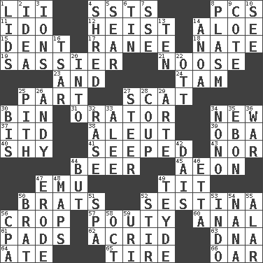 ACROSS 1. Cards in a Roman deck? 4. Fast planes 8. Personal Computers (abbr.) 11. Wedding promise 12. Robbery 14. Medicinal plant 15. Incision 17. Indian princess (variant) 18. Nathan's nickname 19. More disrespectful 21. Trap for birds or small mammals 23. Also 24. Scottish cap 25. Piece 27. Go away! 30. Storage container 31. Speaker 34. ___ Haven, CT 37. It would 38. Native American of Southwest Alaska 39. Chief or king in Benin or Nigeria 40. Like a shrinking violet 41. Oozed 43. And not 44. Fermented drink made from hops 45. A really long time 47. Australian flightless bird 49. Teat (slang) 50. Naughty children 52. French poetic form 56. Riding implement 57. Marked by pouting 60. Of or related to the anus 61. Groovy apts. 62. Sour-tasting 63. Heredity factor (abbr.) 64. Had dinner 65. Hoop that covers a wheel 66. Rowing implement DOWN 1. Flaplike coverings 2. It may be bright or harebrained 3. Charged particles 4. Fragment 5. Dry up 6. Shallow baking pan 7. Compass dir. 8. Suffix with ecto or cyto 9. ____ d'Azur (French Riviera) 10. Perceive with the eye 13. "___ Little Indians" 14. Small Philippine buffalo 16. Russian ruler of old 20. To the inside or interior of 22. Baseball player Mel 25. Heart or essence 26. Actor Griffith 27. Guide 28. Clever action or accomplishment 29. Johnson of "Laugh-In" 30. Twice 32. Raze (variant) 33. Toward shelter 34. Words to Nanette 35. Inky black, to poets 36. Armed conflict 42. Raised platform 44. With the exception that 46. Singer James 47. Eat (away) 48. Atlas contents 49. Miss Universe 1986, Barbara Palacios _ 50. Naughty child 51. Health resort 52. Commotion 53. _ china 54. Nanny 55. Having or resembling wings 56. Numbers guy (abbr.) 58. Sep. follower 59. RI univ.