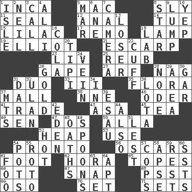 ACROSS 1. South American Indian 5. Big _ 8. Playfully artful 11. Lick closed 12. Of or related to the anus 14. Third day of the wk. 15. Pale purple color 17. San ____ (Riviera town) 18. Desk light 19. American author Paul (1891-1958) 21. Fortification 23. 54 in ancient Rome 25. Reuben's nickname 26. Yawn 27. Sandy's bark 28. Tired old horse 31. Superhero pair 33. One more than two 35. Plants 37. Promenade 38. Compass dir. 40. Baltic tributary 41. Buy and sell 43. White ___ sheet 45. Beverage made from leaves 46. Elected rep. 47. Two (Sp.) 50. Silent film actress Nazimova 52. Pile 53. Purpose 54. Right away 56. Motion picture awards 61. 12 inches 62. Israeli folk dance 65. Drinks excessively 66. Baseball player Mel 67. Fastener 68. Inconspicuous attention getter 69. Bear (Spanish) 70. Arrange properly for use 71. Arranges properly for use DOWN 1. Small island 2. Famous astronaut Armstrong 3. Give a ring to 4. Mountain range southwest of Kyrgyzstan 5. Impair 6. One (Scot) 7. Device for capturing images 8. Play the lead 9. Mass 10. Slangy assent 13. Failure 16. Root beer relative 18. Experiment locale 20. Native american tent (variation) 22. Sleeve end 24. Distinctive style or manner 26. Gilt 28. Thickened enlargement 29. Type of rug 30. Slender fish 31. Have the gumption 32. ____ Bator, Mongolia 34. _ tizzy (2 wds.) 36. Globular water bottle used in Asia 37. Mountains (abbr.) 39. He sold his birthright 42. Locale of original sin 44. In addition 48. Expletives 49. Soup utensils 51. For fear that 52. Being at a high temperature 54. Plant holders 55. Printing process, for short 57. 911 reaches them 58. Domed church section 59. Repose 60. Fast planes 61. Egg _ yung 63. Actress Charlotte 64. Fitting