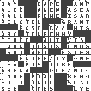 ACROSS 1. 24 hours 4. Stare wonderingly 8. Electrical Unit 11. Actor Baldwin 13. Afresh 14. Toward the sea 15. Promenade 16. French philosopher Descartes 17. Austrian river, tributary to the Danube 18. Manned the helm 21. Monetary aid 22. Airs 23. Sound made by sheep 25. Mountains (abbr.) 26. The grampus (Milton) 29. 3-inch nail 32. Giggle 34. Keyboard modifier key 35. By way of 38. Frog relative 39. Trials 41. Conclusions 43. Indian title of respect (Mr.) 44. Tate display 45. _____ Park, CO 46. Plea 50. Single 51. Beverage made from leaves 54. Twice 55. Become fatigued 57. Sports stadium 59. Pertaining to the sea 63. Old wives' tales, e.g. 64. Monetary unit of Yemen 67. San ____ (Riviera town) 68. Prepare for publication 69. International (abbr.) 70. Narrow board 71. Perceive with the eye 72. Lyric poems 73. Potassium hydroxide DOWN 1. Moist 2. Mountain range southwest of Kyrgyzstan 3. Shout 4. Place where plants grow 5. A saturated hydrocarbon 6. Fenced enclosure 7. She-sheep 8. Indian state 9. Intended 10. Pieces 12. Hoof sound 14. Wind 19. Haul 20. Compass dir. 21. Separate the seeds from cotton 23. Waist strap 24. Pismires 26. Baseball player Mel 27. Vintage cars 28. Burn to charcoal 30. Thick mixture 31. Jacques Cousteau's middle name 33. Singer Brickell 36. To the inside or interior of 37. An important port of Yemen 39. Jacques of French films 40. Blunders 42. Compass dir. 45. Jane of fiction 47. Basketball assoc. 48. Ringlike coral islands and reefs 49. Nervous spasm 51. Stories 52. Wear away 53. Nest on high 56. Hearing organs 58. Fish or hair follower 60. 1994 drama film starring Jodie Foster 61. "If ____ say so..." 62. ____ d'Azur (French Riviera) 64. _ de Janeiro 65. Indiana (abbr.) 66. Had dinner