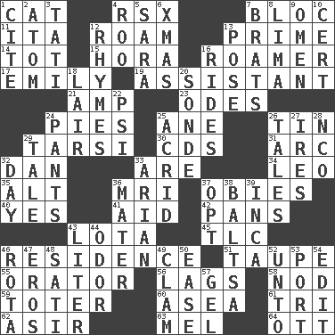ACROSS 1. Domesticated feline 4. Acura sports coupe 7. Coalition 11. Call ___ day 12. Wander 13. First class 14. Small child 15. Israeli folk dance 16. Wanderer 17. Poet Dickinson 19. Aide 21. Electrical Unit 23. Lyric poems 24. Sliced desserts 25. A saturated hydrocarbon 26. Metal container 29. Tarsus (plural) 30. Music discs 31. Curve 32. One of the 12 tribes of Israel 33. "We ___ not amused" (Victoria) 34. Lion 35. The first octave above the treble staff 36. Medical imaging device (abbr.) 37. Off-Broadway awards 40. Consenting reply 41. Assist 42. Baking dishes 43. Globular water bottle used in Asia 45. Affectionate concern, for short 46. Home 51. Grayish beige 55. Speaker 56. Falls behind 58. Dreamland 59. Carrier 60. Toward the sea 61. Three (prefix) 62. SW Saudi Arabia district 63. Cartoonist voice _ Blanc 64. Baseball player Mel DOWN 1. Quote 2. Tiny particle 3. Jacques of French films 4. Friend of Pooh 5. "Two Mules for Sister ____" 6. Dec. holiday 7. Naughty children 8. Pale green bean 9. Sign of something about to happen 10. An absolute certainty 12. Poems 13. Introduce or present, as a question 16. Amusement-park features 18. Den 20. Something which is sent 22. 23rd letter of the Greek alphabet 24. Leg coverings 25. Sour-tasting 26. Lies 27. Angers 28. Non-commissioned officer (abbr.) 29. Story 32. 24 hours 33. Believer in; advocate of (suffix) 36. Mother 37. Choose 38. Greek mezzo-soprano Agnes 39. South American Indian 43. 61 cubic inches 44. Scent 46. Roll call or roster of names 47. Greek god of love 48. Suttee (variant) 49. Burrowing marine mollusk 50. Relaxation 52. To (old English) 53. Sweet dark-red dessert wine 54. Prepare for publication 57. Set