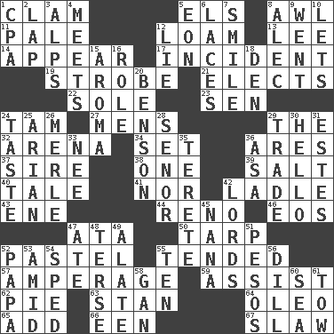 ACROSS 1. Burrowing marine mollusk 5. Raised railways 8. Leather borer 11. Light colored 12. Rich soil 13. Area sheltered from the wind 14. Seem 17. Happening 19. Disco prop 21. Chooses 22. Flatfish 23. Elected rep. 24. Scottish cap 27. Not women's 29. Definite Article 32. Sports stadium 34. Arrange properly for use 36. Ancient Greek god of war 37. Title for a man of rank and authority 38. Single 39. Table seasoning 40. Story 41. And not 42. Dipping utensil 43. Compass dir. 44. Former U.S. Attorney General Janet 46. Greek goddess of the dawn 47. "One Day ___ Time" 50. Canvas cover 52. Soft color 55. Looked after 57. Electrical Measurement 59. Aid 62. Sliced dessert 63. Comedian Laurel of Laurel & Hardy 64. Butter sub 65. Say or write further 66. Car or cant ending 67. Cole _ (cabbage dish) DOWN 1. Tax preparer (abbr.) 2. Infant locale 3. High mountains 4. Confronts 5. Period of immesurable duration 6. Shoestrings 7. Grin 8. Actor Baldwin 9. Left 10. Allows 12. Untruth 15. Odor 16. Hero or heavy, e.g. 18. Lair 20. Gillaume's butler role 24. Clothes sense 25. Believer in; advocate of (suffix) 26. Haggard of country music 28. Sir (Sp.) 29. Buy and sell 30. Phone greeting 31. _____ Park, CO 33. Born 35. Cylindrical with tapered ends 36. White ___ sheet 42. Nobles 45. Nanny 47. Had dinner 48. Laconic 49. Having winglike extensions 51. Mexican monetary units 52. Dad 53. Among 54. Hurried 55. "___ Little Indians" 56. Deli pickle 58. Separate the seeds from cotton 60. Ocean 61. Pull behind