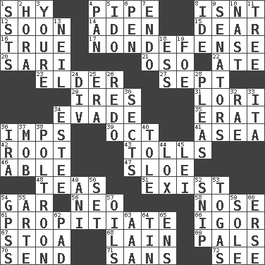 ACROSS 1. Like a shrinking violet 4. Corncob 8. Is not 12. Within a short period 14. An important port of Yemen 15. Letter starter 16. Loyal 17. Unrelated to defense, as in spending 20. Indian skirt 21. Bear (Spanish) 22. Had dinner 23. A person who is older than you are 27. Back-to-school mo. 29. Angers 31. Australian parrot (variant) 34. Dodge 35. Part of Q.E.F. 36. Naughty children 39. Sep. follower 41. At sea 42. Carrot, for example 43. For Whom the Bell _____ 46. Competent 47. _ gin 48. Afternoon social gatherings 51. Have an existence 54. Slender fish 56. Modern: prefix 58. Characteristic smell of wine 61. Conciliate 66. Russian composer Stravinsky 67. Portico 68. (Had) reclined 69. Friends 70. Transmit 71. Without 72. Perceive with the eye DOWN 1. Fast planes 2. Israeli folk dance 3. You are 4. Baking dish 5. Wedding promise 6. Fenced enclosure 7. Inside; within (prefix) 8. Binary compound 9. Elected representatives 10. Political cartoonist Thomas 11. Relationship diagram 13. Famous astronaut Armstrong 18. Curvy letter 19. Enemy 24. HTML Container Element 25. Epoch 26. Redecorate 28. Entreaties 30. Religious groups 32. Actress Charlotte 33. Call ___ day 34. First name in cosmetics 36. Lyricist Gershwin 37. Disorderly crowd 38. Characterized by complete cowardliness 40. Lacquered or enameled metalware 44. Brine-cured salmon 45. Luau accessory 49. Black tropical American cuckoo 50. Put into a specified state 52. Sever or remove by pinching or nipping 53. Ancient Roman robes 54. Global Positioning Systems (abbr.) 55. Johnson of "Laugh-In" 57. Lubricates 59. Not divided or shared with others 60. Celtic language 62. Groovy apt. 63. American Automobile Association (abbr.) 64. Metal container 65. Followers of ems