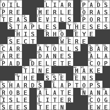 ACROSS 1. Lubricate 4. One who doesn't tell the truth 8. Writing tablets 12. Before (prefix) 13. Haggard of country music 14. Mouths or openings 15. Afternoon social gatherings 17. Vices 18. Sweet dark-red dessert wine 19. Paper fasteners 21. College papers 23. Part of HMS, perhaps 24. 17th letter of the Greek alphabet 26. Sight organ 27. Religious group 28. Past tense of be (plural) 30. Automobile 31. Ringlike coral islands and reefs 34. Soap unit 37. "We ___ not amused" (Victoria) 38. Natives or inhabitants of Denmark 39. Chicken ___ king 40. Writing tablet 41. Keyboard key 42. Police officer (slang) 43. Prong on a fork 44. Create 46. Definite Article 47. Compass dir. 50. Followers of ems 51. Broken pieces 54. Portable computers 57. Loose flowing garment 58. Having winglike extensions 60. Grandmother 62. Capri or Wright 63. 61 cubic inches 64. Gear tooth 65. Perceives with the eye 66. Adolescent 67. She-sheep DOWN 1. Elect 2. Angers 3. Tough but pliablecoriaceous 4. Prying instrument 5. From or relating to Ireland 6. 100% 7. Respite 8. Wimpy's pal 9. Came up 10. Have the gumption 11. Fast planes 13. Cartoonist voice _ Blanc 16. Ketch in the Levant 20. Pacific Standard Time (abbr.) 22. Possessive pronoun 25. A small or young owl 27. "Two Mules for Sister ____" 29. Otherwise 30. Head covering 31. An important port of Yemen 32. Stories 33. Single 34. Keyboard key 35. _ vera 36. Strike 41. Passed on 43. Triads 44. Was introduced to 45. Soon (poet.) 46. Eating place 48. Chalkboard 49. Ingested 51. Indian titles of respect 52. Stockings 53. Table seasoning 55. For each 56. Overwhelm 59. Falsehood 61. Grow older