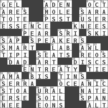 ACROSS 1. Set 4. Arabian gulf 8. Sep. follower 11. Ancient Greek god of war 13. Undercover agent 14. "Two Mules for Sister ____" 15. Carry 16. Inconspicuous attention getter 17. One who makes use of a thing 18. Gist 21. Leg joints 22. Lightbulb-shaped fruit 23. _ Lanka 25. What Jean-Claude Killy likes to do 26. Plant excrement 29. Orators 32. Don Adams' spy role 34. Experiment locale 35. Leather borer 38. Native american tent (variation) 39. Theater features 41. Vintage cars 43. Male parent 44. Nonscientific branch of learning 45. Plates 46. Plea 50. Neckwear 51. Wet nurse (var.) 54. Twice 55. Metal containers 57. Father Junipero _ 59. Pertaining to the sea 63. Portico 64. Mountain range 67. Nathan's nickname 68. Celtic language 69. The visible part of the earth's surface 70. Connect, as a bridge 71. Born 72. Immeasurably long periods of time 73. The first octave above the treble staff DOWN 1. Yard entry 2. Greek god of love 3. Allows 4. Electrical Unit 5. Two (Sp.) 6. Raised railways 7. Fish or hair follower 8. Fertile tracts in a desert 9. Small stream 10. Tarsus (plural) 12. Ooze 14. Player for Phoenix 19. A home for chicks 20. Head covering 21. Apertif with cassis 23. Three-handed card game 24. Confederate soldiers (slang) 26. Fast jet (abbr.) 27. Among 28. Dad 30. Having winglike extensions 31. Indian skirt 33. Travel on or in a vehicle 36. Compass direction 37. Event scenes 39. Suttee (variant) 40. Blunders 42. Compass dir. 45. Centimeter-gram-second unit of force 47. Basketball assoc. 48. Ringlike coral islands and reefs 49. Nervous spasm 51. NE Netherlands city 52. Distance measurement (Brit.) 53. Came up 56. Without 58. Actress Charlotte 60. California wine valley 61. Slanted text style (abbr.) 62. Penny 64. Purpose 65. Friend of Pooh 66. The 18th letter of the Arabic alphabet