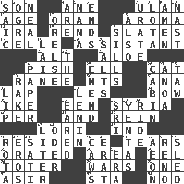 ACROSS 1. Boy, to dad 4. A saturated hydrocarbon 7. Uhlan (variant) 11. Grow older 12. NW Algerian seaport 13. Scent 14. Lyricist Gershwin 15. Tear apart 16. Chalkboards 17. Cell (Danish) 19. Aide 21. The first octave above the treble staff 23. Medicinal plant 24. Expression of disdain 25. Pipe bend 26. Feline 29. Indian princess (variant) 30. Mountains (abbr.) 31. Santa ___, CA 32. Pet locale 33. French article 34. Arrow shooter 35. Mamie's husband 36. Car or cant ending 37. Damascus' land 40. For each 41. Also 42. It's straight from the horse's mouth 43. Australian parrot (variant) 45. Indiana (abbr.) 46. Home 51. Pulls into pieces 55. Spoke pompously 56. Type of rug 58. Snakelike fish 59. Carrier 60. Armed conflicts 61. Single 62. SW Saudi Arabia district 63. R.R. building 64. Lower and raise head in agreement DOWN 1. Ketch in the Levant 2. Legendary monster 3. Anneal 4. "We ___ not amused" (Victoria) 5. Nanny 6. Conclusions 7. A salt of uric acid 8. Globular water bottle used in Asia 9. So be it 10. Political cartoonist Thomas 12. Threatening words 13. In addition 16. Beverly of Met fame 18. (Had) reclined 20. Table seasonings 22. Definite Article 24. Some stationery 25. Make improvements or corrections to 26. Apartment or room in a ship 27. Small Philippine buffalo 28. The 23rd letter of the Hebrew alphabet 29. Libertine 32. Mouth edge 33. Soviet premier 1918-24 36. Having ears or earlike features 37. Indian title of respect (Mr.) 38. Gossips 39. Travel on an animal 43. 61 cubic inches 44. Baltic tributary 46. Roll call or roster of names 47. Greek god of love 48. Suttee (variant) 49. Crow sounds 50. Part of Q.E.F. 52. Age 53. Former U.S. Attorney General Janet 54. Downhill vehicle 57. Period