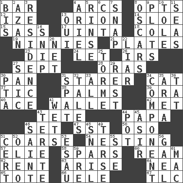 ACROSS 1. Oblong piece of solid material 4. Curves 8. Chooses 12. Ending with capital 13. Constellation of myth 14. _ gin 15. Backtalk 17. National forest in Provo, Utah 18. Root beer relative 19. Simpletons 21. Food holders 23. Pass on 24. Allow 26. Big collection agency 27. Back-to-school mo. 28. Mouths or openings 30. Baking dish 31. A viewer who gazes fixedly 34. Domesticated feline 37. Nervous spasm 38. Insides of hands 39. Mouth or opening 40. Adept person 41. Place for singles 42. Was introduced to 43. False hair 44. Dad 46. Arrange properly for use 47. Fast jet (abbr.) 50. Bear (Spanish) 51. Unrefined 54. Inhabiting a nest 57. Writer Wiesel 58. Practice fights 60. 480, 500 or 516 sheets of paper 62. Monthly bill 63. Ascend 64. Teachers' org. 65. Carry 66. Ubangi River tributary 67. Affectionate concern, for short DOWN 1. Twice 2. Muslim summons to prayer 3. Home 4. Satellite of Uranus 5. Remove soap 6. Small bed 7. Fastener 8. Motion picture awards 9. Schemes 10. Lacquered or enameled metalware 11. Oceans 13. Fr. "Yes" 16. Sever or remove by pinching or nipping 20. Fish or hair follower 22. One who doesn't tell the truth 25. Singer Mel 27. Ketch in the Levant 29. Take ten 30. Parent Teacher Association (abbr.) 31. Petty quarrel 32. Lies 33. Everything 34. Piece 35. Length times width 36. Make lace 41. Moistens 43. Cigar-shaped 44. Cooking vessel 45. SW Saudi Arabia district 46. Virtuous person 48. Slow-paced one 49. Laconic 51. Certainty 52. Margarine 53. Son of Isaac 55. Compass dir. 56. Highlander 59. Before (prefix) 61. Big _