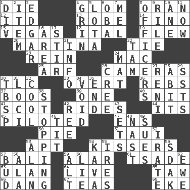 ACROSS 1. Expire 4. Seize upon or latch onto something 8. NW Algerian seaport 12. It would 13. Loose flowing garment 14. Fine (Spanish) 15. Viva Las _ 18. Slanted text style (abbr.) 19. Soared 20. Chrissie's court nemesis 22. Make a knot 23. It's straight from the horse's mouth 24. Big _ 25. Sandy's bark 26. Devices for capturing images 30. Affectionate concern, for short 33. Unconcealed 36. Confederate soldiers (slang) 37. Scornful sounds 39. Single 40. In a ____ (agitated or irritated) 41. Highlander 42. Amusement-park features 44. It is 45. Manned the helm 47. Followers of ems 50. Sliced dessert 51. "Change" in Tahitian 53. Fitting 54. Smoochers 57. Indonesian resort city 59. Having or resembling wings 61. Sadhe (variant) 63. Uhlan (variant) 64. Moving, as bait 65. The 23rd letter of the Hebrew alphabet 66. Mild oath, euphamism for damn 67. Beverages made from leaves 68. Make supply last DOWN 1. HTML Container Element 2. Detail 3. _ Allan Poe 4. Broad smile 5. Globular water bottle used in Asia 6. Chief or king in Benin or Nigeria 7. Cartoonist voice _ Blanc 8. Persons of authority 9. Cause heat under the collar 10. A saturated hydrocarbon 11. At this time 16. Type of rug 17. Use a swizzle stick 21. Information 22. Scottish cap 24. Floor covering 26. Algonquian 27. Painter Guido (1575-1642) 28. "This won't hurt ____!" 29. Fast planes 30. Cook's measure (abbr.) 31. Venues 32. Calm and collected 34. Nothingness 35. Conclusion 38. Obstructing or blocking passage 42. To separate or throw off 43. Puts into a specified state 46. Teat (slang) 48. Political cartoonist Thomas 49. Institutes legal proceedings 52. Feeling or showing extreme anger 53. Actor Alda or Thicke 54. Polynesian shrub of the pepper family 55. Angers 56. Neighbor of Neb. 57. Partially opened flower 58. Chicken ___ king 59. Keyboard modifier key 60. Whopper 62. She-sheep