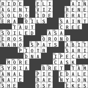 ACROSS 1. Travel on or in a vehicle 5. Biblical high priest 8. The 18th letter of the Arabic alphabet 11. Representative 13. Namely 14. French philosopher Descartes 15. Twentieth part of a lira 16. Binary compound 17. Part of Q.E.F. 18. Period 19. Petroleums 21. Inhabitant of Heaven 22. Drawn tight 24. Algonquian 25. Dirtied 27. White ___ sheet 29. Greek god of love 30. U. of Maine site 32. Billionth: prefix 33. Arguments over trivial matters 35. "This won't hurt ____!" 39. Peter (Polish) 41. Indian skirt 42. Heredity factor (abbr.) 43. Medicinal drug used to evoke vomiting 45. Greater amount 48. Keg 49. Damascus' land 50. Cy Young winner Saberhagen 52. Scottish cap 55. Of or related to the anus 56. Sliced dessert 57. Peak District village in England 59. Nathan's nickname 60. Actress Charlotte 61. High-strength synthetic material 62. A female animal or person 63. Order of Saint Francis (abbr.) 64. Makes supply last DOWN 1. Raze (variant) 2. Composer Stravinsky 3. Conveyance 4. Conclude 5. Tending to cause great harm 6. Flaplike coverings 7. Ending with capital 8. Nest on high 9. Silly 10. Remaining after all deductions 12. Woman's close-fitting hat 14. Bring up, as a child 20. It would 21. Examine hastily 23. Columnist Joseph or Stewart 25. Elected rep. 26. Mouth or opening 27. Nonscientific branch of learning 28. Mayday 30. Rowing implement 31. Fertile tracts in a desert 33. Boy, to dad 34. Parent Teacher Assoc. 36. Sass 37. Retirement account (abbr.) 38. Nervous spasm 40. It may be bright or harebrained 43. Frozen water 44. Eucharist need 45. Non-adult bird? 46. Speak pompously 47. Cause heat under the collar 49. Without 50. Prejudice 51. Coral collection 53. _ vera 54. Not women's 56. Adept person 58. Color