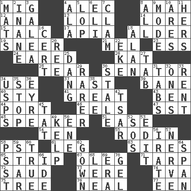 ACROSS 1. Russian fighter aircraft 4. Actor Baldwin 8. Wet nurse 12. Santa ___, CA 13. Hang loosely or laxly 14. Old wives' tales, e.g. 15. Baby powder 17. Capital of Western Samoa 18. Tree or shrub in the Birch family 19. Contemptuous expression 21. Cartoonist voice _ Blanc 23. Curvy letter 24. Having ears or earlike features 26. Krazy ___ of comics 28. Separate forcefully 30. Elected representative 34. Purpose 37. Political cartoonist Thomas 39. Object of repulsion 40. Filthy place 41. Relatively large 43. Benjamin's nick name 44. Sweet dark-red dessert wine 46. Snakelike fish 47. Fast jet (abbr.) 48. Orator 51. Comfort 54. Nine, plus one 55. "The Thinker" sculptor 58. Pacific Standard Time (abbr.) 61. Part of a journey 63. Fathers 65. Empty completely 67. Cassini of fashion 71. Canvas cover 72. Saudi Arabian king (1953-1964) 73. Past tense of be (plural) 74. Federal power corp. 75. Family _ (genealogy) 76. Be tempered by heat 77. Car or cant ending DOWN 1. Floor coverings 2. Lacking in sense or substance 3. An organ shaped like a helmet 4. Chicken ___ king 5. Trim (branches) 6. Connecticut Ivy Leaguer 7. Dollar (slang) 8. Everything 9. Method 10. Ancient Greek god of war 11. Possessive pronoun 16. An absolute certainty 18. ____ Jay Lerner 20. To sift 22. Make supply last 25. Mild oath, euphamism for damn 27. Keyboard key 29. More uncommon 30. Having lost freshness 31. Bar bills 32. Washington bills 33. Monthly bill 34. United States Postal Service (abbr.) 35. Close up, plug up 36. Jane of fiction 38. Perceive with the eye 42. Russian ruler of old 45. Make lace 49. Seaweed 50. Compass dir. 52. Mayday 53. Prepare for publication 56. Feeling or showing extreme anger 57. Impudent aggressiveness 58. Inconspicuous attention getter 59. Play the lead 60. Loyal 62. Long dress 64. Connect, as a bridge 66. Binary compound 68. Area sheltered from the wind 69. Period 70. Set