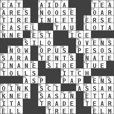 ACROSS 1. Consume 4. Opera by Verdi 8. Beverage made from leaves 11. Ancient Greek god of war 13. Trap for birds or small mammals 15. Boat paddle 16. Hoop that covers a wheel 17. An arm off of a larger body of water 18. Celtic language 19. Artist's stand 21. The 19th letter of the Greek alphabet 22. Globular water bottle used in Asia 23. Compass dir. 24. Eastern Standard Time (abbr.) 27. Frozen water 29. Grain storage tower 30. Baking chambers 34. Immediately 36. Musical composition 39. Mexican monetary units 40. "Two Mules for Sister ____" 41. Portable shelters 43. Nathan's nickname 44. Lacking in sense or substance 46. Male parent of an animal 47. Third day of the wk. 48. For Whom the Bell _____ 49. Hankering 51. Viper 53. Infant food 54. Followers of ems 57. Pig sound 60. _-fi 63. Indian state 65. Leg joint 66. Indian antelope 69. Singer James 70. Call ___ day 71. Barter 72. Pull apart 73. Pipe bend 74. Relationship diagram 75. Shade tree DOWN 1. Consumed 2. Believer in; advocate of (suffix) 3. Laconic 4. Black tropical American cuckoo 5. Electrically charged atom 6. Dunce 7. Toward the sea 8. "Corrida" creature 9. 90 degrees 10. Length times width 12. Perceive with the eye 14. Needle holder 18. Veterans Day date 20. Flowery wreath 25. Narrow opening 26. Drinks excessively 28. Police officer (slang) 29. Tchaikovsky ballet 31. Son of Isaac 32. Brief written record 33. Compass dir. 34. Billionth: prefix 35. Taken by mouth 37. Single; one (prefix) 38. Empty completely 40. Be seated 42. Stalk of a moss capsule 45. Curvy letter 50. Numbers guy (abbr.) 52. Inconspicuous attention getter 54. First name in cosmetics 55. Brizilian seaport 56. Excessive but superficial compliments 57. Migrant worker of the '30s 58. International (abbr.) 59. Anneal 61. Draw slowly or heavily 62. Austrian river, tributary to the Danube 64. Arrange properly for use 67. Binary compound 68. Born