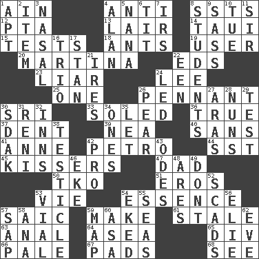 ACROSS 1. The 18th letter of the Arabic alphabet 4. Against 8. Fast planes 12. Parent Teacher Association (abbr.) 13. Den 14. "Change" in Tahitian 15. Trials 18. Pismires 19. One who uses or employs something 20. Chrissie's court nemesis 22. Begley and Asner 23. One who doesn't tell the truth 24. Area sheltered from the wind 25. Single 26. Pre-World Series prize 30. Indian title of respect (Mr.) 33. Having a sole or soles 36. Loyal 37. Scratch 39. Teachers' org. 40. Without 41. Queen of England 1702-14 42. Stone: prefix 44. Fast jet (abbr.) 45. Smoochers 47. June honoree 50. Ring climax 51. Greek god of love 53. Compete 54. Core 57. Ketch in the Levant 59. Create 61. Having lost freshness 63. Of or related to the anus 64. Toward the sea 65. HTML Container Element 66. Light colored 67. Writing tablets 68. Observe DOWN 1. Fitting 2. Detail 3. Relating to the nose 4. Actor Alda or Thicke 5. Grandmother 6. Teat (slang) 7. Big collection agency 8. SAT takers 9. Backtalk 10. Third day of the wk. 11. Title for a knight 16. Musical group of three 17. Comedian Laurel of Laurel & Hardy 21. Angers 22. Car or cant ending 24. Directed 26. Lightbulb-shaped fruit 27. Ancient river in northeast Turkey 28. Religious women 29. Trial 30. Neighbor of Neb. 31. Painter Guido (1575-1642) 32. Lodging establishments 34. Singles 35. Allow 38. A testis 42. Adept person 43. Lyric poems 46. Make supply last 48. Ancient Greek god of war 49. Do not 52. Loads 53. Small bottle 54. Made supply last 55. Oceans 56. Writer Wiesel 57. Plant excrement 58. Santa ___, CA 59. Atlas unit 60. White ___ sheet 62. Night before a holiday