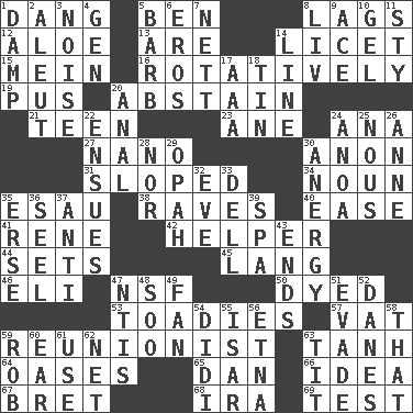 ACROSS 1. Mild oath, euphamism for damn 5. Benjamin's nick name 8. Falls behind 12. Medicinal plant 13. "We ___ not amused" (Victoria) 14. It is permitted: Lat. 15. Count _ (2 wds.) 16. Producing rotation 19. Ichor 20. Refrain by choice 21. Adolescent 23. A saturated hydrocarbon 24. Santa ___, CA 27. Billionth: prefix 30. Soon (poet.) 31. Inclined 34. Part of speech 35. He sold his birthright 38. All-night dance parties 40. Relaxation 41. French philosopher Descartes 42. Assistant 44. Arranges properly for use 45. Long (Scottish) 46. Biblical high priest 47. Overdraft (abbr.) 50. Colored 53. Sycophants 57. Large container 59. One who advocates reunion 63. Hyperbolic tangent 64. Fertile tracts in a desert 65. Daniel's nick name 66. The content of cognition 67. Cy Young winner Saberhagen 68. Lyricist Gershwin 69. Trial DOWN 1. Moist 2. Eskimo relative 3. Annoying sound 4. Commissioned military rank (abbr.) 5. Sharp remark 6. Greek god of love 7. Remaining after all deductions 8. 54 in ancient Rome 9. Adept person 10. Set 11. Filthy place 14. Actor's bit 17. American Automobile Association (abbr.) 18. Shallow baking pan 20. Of or related to the anus 22. Follows as a consequence or result 24. Small Philippine buffalo 25. Horse sense 26. Queen of England 1702-14 28. And not 29. Brightly colored fish 30. Disorder of the immune system 32. Night before a holiday 33. Small valley 35. Celtic language 36. Stitch closed the eyes of (a falcon) 37. Opposed to 39. Health resort 43. Conclusions 47. Nuclear Threat Initiatives 48. "Barney Miller" actor Jack 49. Air blower 51. Elude 52. Natives or inhabitants of Denmark 54. "You Light Up My Life" star Conn 55. Austrian river, tributary to the Danube 56. Inactive volcano in Sicily 58. Not this but _ 59. Director Reiner 60. Ewer handle 61. Purpose 62. Fish or hair follower 63. Teat (slang)