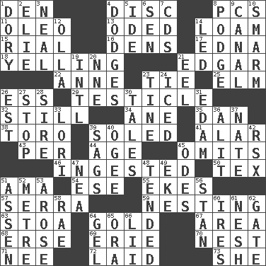 ACROSS 1. Lair 4. Flat circle 8. Personal Computers (abbr.) 11. Butter sub 13. Wrote a lyric poem 14. Rich soil 15. Monetary unit of Yemen 16. Cub Scout units 17. Pulitzer Prize-winning author Ferber 18. Crying or shouting loudly 21. _ Allan Poe 22. Queen of England 1702-14 23. Neckwear 25. Shade tree 26. Double-curved letter 29. One of the two male reproductive glands 32. Free from disturbance or agitation 34. One (Scot) 35. Daniel's nick name 38. "Corrida" creature 39. Having a sole or soles 41. Having or resembling wings 43. For each 44. Mature 45. Leaves out 46. Consumed 50. John Ritter's dad 51. Nanny (var.) 54. Compass dir. 55. Supplements with great effort 57. Spanish missionary in California 59. Snuggling 63. Portico 64. Precious metal 67. Length times width 68. Celtic language 69. One of the Great Lakes 70. A home for chicks 71. Born 72. Put down 73. A female animal or person DOWN 1. Dinghy 2. Writer Wiesel 3. Actress Patricia 4. Evades 5. Binary compound 6. Elected rep. 7. Music discs 8. Puddle 9. Lessep's creation 10. Excessive but superficial compliments 12. Rounded earthenware pot or jar 14. Directed 19. International (abbr.) 20. Compass dir. 21. Snakelike fish 23. Prong on a fork 24. On the rocks 26. Eastern Standard Time (abbr.) 27. Close up, plug up 28. Male parent of an animal 30. Falsehoods 31. Dutch treat 33. Australian parrot (variant) 36. Set down 37. Nathan's nickname 39. Droops 40. Double curve, resembling the letter S 42. Acura sports coupe 45. Lyric poems 47. Teachers' org. 48. Looked after 49. Make supply last 51. NE Netherlands city 52. Distance measurement (Brit.) 53. Came up 56. Comedian Laurel of Laurel & Hardy 58. Actress Charlotte 60. Angers 61. Soft 62. Yard entry 64. Set 65. Mouth or opening 66. Cards in a Roman deck?
