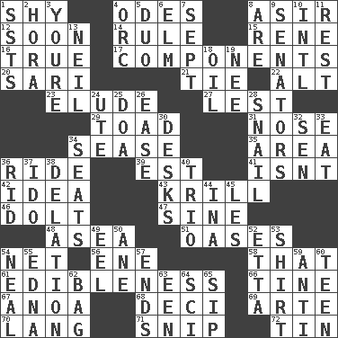 ACROSS 1. Like a shrinking violet 4. Lyric poems 8. SW Saudi Arabia district 12. Within a short period 14. Court order 15. French philosopher Descartes 16. Loyal 17. Parts 20. Indian skirt 21. Make a knot 22. Keyboard modifier key 23. Dodge 27. For fear that 29. Frog relative 31. Characteristic smell of wine 34. Gospel singer Marvin 35. Type of rug 36. Travel on or in a vehicle 39. Eastern Standard Time (abbr.) 41. Is not 42. It may be bright or harebrained 43. Shrimp-like planktonic crustaceans 46. Dunce 47. Trig term 48. At sea 51. Fertile tracts in a desert 54. Fish or hair follower 56. Compass dir. 58. Not this but _ 61. The property of being fit to eat 66. Prong on a fork 67. Small Philippine buffalo 68. Tenth: prefix 69. Johnson of "Laugh-In" 70. Long (Scottish) 71. Clip 72. Shallow baking pan DOWN 1. Fast planes 2. Israeli folk dance 3. You are 4. The grampus (Milton) 5. Superhero pair 6. Shade tree 7. Back-to-school mo. 8. "We ___ not amused" (Victoria) 9. Legislators 10. International (abbr.) 11. Take ten 13. Famous astronaut Armstrong 18. Petroleum 19. Born 24. Shoshoni 25. ___ good deed 26. Relaxation 28. Slow-paced one 30. Writing tables 32. Elected rep. 33. Consume 34. Theater features 36. To free from 37. Wedding promise 38. Accusation by an informer 40. Musical group of three 44. _ tizzy (2 wds.) 45. French article 49. Snakelike fish 50. One (Scot) 52. Singer James 53. Chest covering 54. Be tempered by heat 55. Pulitzer Prize-winning author Ferber 57. Extremities 59. Against 60. Adolescent 62. Container for groceries 63. Car or cant ending 64. _-fi 65. Small drink