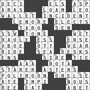 ACROSS 1. Tenth: prefix 5. Raised railways 8. Viper 11. Caspian sea tributary 12. Rich soil 13. Lion 14. Place for singles 17. Happening 19. Poe poem 21. Chooses 22. Pacific island yam 23. Elected rep. 24. Compass dir. 27. Heavy book 29. Dripping 32. White Person, in Hawaii 34. Curvy letter 36. Celtic language 37. Mitch Miller's instrument 38. Baseball player Mel 39. Erode 40. Travel on or in a vehicle 41. Ocean 42. Writing tables 43. Followers of ems 44. Father 46. Standoff 47. Auto club (abbr.) 50. Round or rotation of duties 52. A viewer who gazes fixedly 55. Michaelmas daisies 57. Characterized by complete cowardliness 59. Threatening words 62. Had dinner 63. Body of Kaffir warriors 64. Common sense 65. To sift 66. Ingest 67. Collude with DOWN 1. Simpleton 2. Epoch 3. Give a ring to 4. Small island 5. Period of immesurable duration 6. Shoestrings 7. Grin 8. Actor Baldwin 9. Transmitted 10. Plant holders 12. Falsehood 15. Maternal 16. "Corrida" creature 18. Lair 20. Lover boys 24. Dinah or Pauly 25. Unit of acoustic absorption 26. Forest 28. _____ Park, CO 29. Take or capture by force 30. 1973 Nobel Price Winner (Physics) Leo 31. Laconic 33. Area sheltered from the wind 35. Flight of steps 36. She-sheep 42. Prevent from occurring 45. Printing process, for short 47. Nonscientific branch of learning 48. Nest on high 49. Odor 51. Sports stadium 52. Coast Guard woman 53. Lug 54. Toward shelter 55. Black tropical American cuckoo 56. Messy guy 58. Elect 60. Take to court 61. Eastern Standard Time (abbr.)