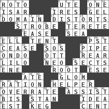 ACROSS 1. Printing process, for short 5. Shoshoni 8. Single 11. Austrian river, tributary to the Danube 12. Angers 13. Set 14. Kingdom 17. What propaganda does 19. Disco prop 21. Cigar-shaped 22. Relaxation 23. Ocean 24. Pipe bend 27. Portable shelter 29. Pacific Standard Time (abbr.) 32. Stop 34. Distress signal 36. Corncob 37. Southwest Nigerian state 38. Baseball player Mel 39. Tail end 40. _ and Stitch 41. Modern: prefix 42. Religious groups 43. Compass dir. 44. Carrot, for example 46. Compass dir. 47. Had dinner 50. Seize upon or latch onto something 52. Food allowance for one day 55. Assistant 57. Make much ado about nothing 59. Help 62. Altar cloth linen 63. Comedian Laurel of Laurel & Hardy 64. It may be bright or harebrained 65. Eastern Standard Time (abbr.) 66. Barrel 67. Penny DOWN 1. To free from 2. Bear (Spanish) 3. Scottish caps 4. Speak pompously 5. RI univ. 6. Trials 7. First name in cosmetics 8. Legendary monster 9. Remaining after all deductions 10. Otherwise 12. Binary compound 15. Feeling or showing extreme anger 16. Characteristic smell of wine 18. Mouth or opening 20. Gillaume's butler role 24. Learning spot: Fr. 25. Soviet premier 1918-24 26. Dipping utensil 28. Carrier 29. Part 30. Arguments over trivial matters 31. Laconic 33. "Barney Miller" actor Jack 35. Moe Howard, for one 36. Before (prefix) 42. Halts 45. Water jar 47. Atmosphere 48. Cod relative 49. Maternal 51. Mesonic 52. Loose flowing garment 53. Opinion 54. Trial 55. Layer 56. Travel on an animal 58. Label 60. Elected rep. 61. Make lace