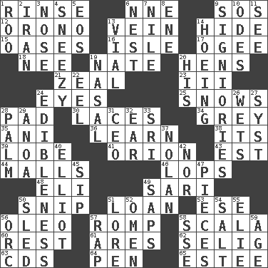 ACROSS 1. Remove soap 6. Compass dir. 9. Distress signal 12. U. of Maine site 13. Distinctive style or manner 14. Flintstone garb 15. Fertile tracts in a desert 16. Capri or Wright 17. Double curve, resembling the letter S 18. Born 19. Nathan's nickname 20. Coop moms 21. Ardor 23. One more than two 24. Sight organs 25. Overwhelms 28. Writing tablet 30. Shoestrings 34. Jennifer or Joel 35. Cuckoo 36. Acquire or gain knowledge or skills 38. It is 39. Ear part 41. Constellation of myth 43. Eastern Standard Time (abbr.) 44. Shopping centers 46. Chops off 48. Connecticut Ivy Leaguer 49. Indian skirt 50. Clip 51. Grant temporary use of 53. Compass dir. 56. Butter sub 57. Frolic 58. Any of the three canals of the cochlea 60. State of inaction 61. Ancient Greek god of war 62. Former Milwaukee Brewers owner Bud 63. Music discs 64. Animal enclosure 65. First name in cosmetics DOWN 1. Friend of Pooh 2. SW Asia republic 3. Sense of smell 4. Dwarf with a sinus problem 5. Greek goddess of the dawn 6. A home for chicks 7. Mediterranean tributary 8. Compass dir. 9. Seigniories (variant) 10. Lyric poems 11. Perceive with the eye 13. Small bottle 14. Weeding 19. Relating to the nose 20. Part of HMS, perhaps 22. Snakelike fish 24. The property of being fit to eat 26. Moistens 27. System (abbr.) 28. Inside of hand 29. Small Philippine buffalo 31. Corporate head (abbr.) 32. Hearing organ 33. _ Lanka 37. Pitcher Ryan 40. American author Paul (1891-1958) 42. Not either 45. Small drink 47. Components 49. Plant excrements 50. Downhill vehicle 51. Old wives' tales, e.g. 52. Sign of something about to happen 54. Table seasoning 55. Writer Wiesel 56. The grampus (Milton) 57. Reproach for some lapse or misdeed 58. Compass dir. 59. Personal question