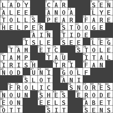 ACROSS 1. Kenny Rogers chart-topper in '80 5. Automobile 8. Elected rep. 11. Toward shelter 12. Small Philippine buffalo 14. Potassium hydroxide 15. For Whom the Bell _____ 17. Lightbulb-shaped fruit 18. Conductor's collection 19. Aide 21. Moe Howard, for one 23. The 18th letter of the Arabic alphabet 25. Periodic rise and fall of the sea level 26. Capri or Wright 27. Observe 28. Part of a journey 31. Scottish cap 33. And so on (abbr.) 35. Fur scarf 37. Pack (down) 38. The 19th letter of the Greek alphabet 40. Slanted text style (abbr.) 41. From or relating to Ireland 43. Three (prefix) 45. Avid follower 46. Dreamland 47. University (slang) 50. Eighteen holes 52. Groove 53. Black tropical American cuckoo 54. Play 56. Sounds asleep 61. Part of speech 62. "______ My Girl" (Turtles hit) 65. Wear away 66. Age 67. Snakelike fish 68. Collude with 69. Baseball player Mel 70. Be seated 71. Elected reps. DOWN 1. Thin strip of wood or metal 2. Medicinal plant 3. Small valley 4. Sharp bark 5. Head covering 6. One (Scot) 7. Cooks with dry heat, as in an oven 8. Volcanic refuse 9. Jane of fiction 10. Born 13. Nick name for Arthur 16. Oceans 18. Enemy 20. Cause heat under the collar 22. Lyric poems 24. Remaining after all deductions 26. Naughty children 28. Globular water bottle used in Asia 29. Enthusiasm 30. Set 31. Pacific island yam 32. Among 34. Feline 36. Small quarrel 37. Shallow baking pan 39. Capital and largest city of Mongolia 42. Frame or body of a ship 44. Charged particles 48. Annoying sound 49. Skin irritations 51. Actor's bit 52. Male offspring 54. One third of a yard 55. The smallest animal of a litter 57. Mouths or openings 58. Loose flowing garment 59. Genesis locale 60. Puts into a specified state 61. Modern: prefix 63. Connecticut Ivy Leaguer 64. Fast jet (abbr.)