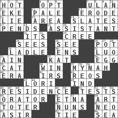 ACROSS 1. Being at a high temperature 4. Choose 7. ____ Bator, Mongolia 11. Make supply last 12. Light colored 13. Wear away 14. Falsehood 15. Type of rug 16. Chalkboards 17. Hangs 19. Helper 21. It is 23. Algonquian 24. Observes 25. Perceive with the eye 26. Cooking vessel 29. Dipping utensil 30. Followers of ems 31. Nilotic language 32. The 18th letter of the Arabic alphabet 33. Krazy ___ of comics 34. Ovum 35. Domesticated feline 36. Acquire through effort 37. Non-adult bird? 40. Period 41. Big collection agency 42. Vintage cars 43. Australian parrot (variant) 45. Working for oneself (abbr.) 46. Dwelling 51. Trials 55. Speaker 56. Inactive volcano in Sicily 58. Nonscientific branch of learning 59. Carrier 60. Religious women 61. Modern: prefix 62. SW Saudi Arabia district 63. Standoff 64. Ocean DOWN 1. Aid 2. Migrant worker of the '30s 3. Adolescent 4. Boat paddle 5. Entreaty 6. Beverages made from leaves 7. A salt of uric acid 8. Globular water bottle used in Asia 9. Arabian gulf 10. Egg locale 12. Soft color 13. Otherwise 16. Begets 18. Passed on 20. Odor 22. Compass dir. 24. Before Barbara or Clara 25. Seines 26. Entreaties 27. Ending for "Through" and "Enough" 28. Coat; cloak 29. One who doesn't tell the truth 32. Adept person 33. Japanese brewing company 36. One who wires 37. Medical imaging device (abbr.) 38. Gossips 39. Thickened enlargement 43. 61 cubic inches 44. Scent 46. Round or rotation of duties 47. Greek god of love 48. Suttee (variant) 49. Penny 50. Needle holder 52. Without 53. Woody plant 54. Portico 57. Compass dir.