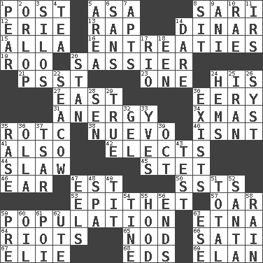ACROSS 1. Mail 5. White ___ sheet 8. Indian skirt 12. 4th largest of the Great Lakes 13. Reproach for some lapse or misdeed 14. Middle Eastern gold or silver currency 15. Silent film actress Nazimova 16. Pleas 19. Friend of Pooh 20. More disrespectful 21. Inconspicuous attention getter 23. Single 24. Part of HMS, perhaps 27. Compass direction 30. Suggestive of the supernatural 31. Disorder of the immune system 34. Dec. holiday 35. College mil. group 38. New (sp.) 40. Is not 41. In addition 42. Chooses 44. Cole _ (cabbage dish) 45. Proofreading order 46. Ewer handle 47. Eastern Standard Time (abbr.) 50. Fast planes 53. Curse 57. Rowing implement 59. Census information 63. Inactive volcano in Sicily 64. Debaucheries 65. Lower and raise head in agreement 66. Suttee (variant) 67. Writer Wiesel 68. Begley and Asner 69. Liveliness DOWN 1. Lightbulb-shaped fruit 2. Lowest deck of a ship 3. Grain storage towers 4. Afternoon social gathering 5. Length times width 6. Without 7. Tenement units (abbr.) 8. Be seated 9. Black tropical American cuckoo 10. Actress Charlotte 11. Big collection agency 14. Have the gumption 17. _ de Janeiro 18. Car or cant ending 20. Comedian Laurel of Laurel & Hardy 22. Manatee 24. Cloth borders 25. SW Asia republic 26. System (abbr.) 28. Elected rep. 29. Loyal 30. Has an existence 32. Set 33. Jacques Cousteau's middle name 35. Raze (variant) 36. Rounded earthenware pot or jar 37. Russian ruler of old 39. Sep. follower 43. Trial 47. Snakelike fish 48. Health resort 49. Teat (slang) 51. "_____ Recall" 52. Before Barbara or Clara 54. Prong on a fork 55. Parka part 56. Extremities 58. Water falling in drops from the sky 59. Before (prefix) 60. Lubricate 61. Luau course 62. Shoshoni 63. Compass dir.