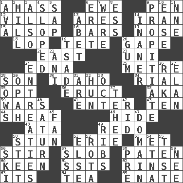 ACROSS 1. Collect or gather 6. She-sheep 9. Writing instrument 12. Country estate 13. Ancient Greek god of war 14. SW Asia republic 15. Columnist Joseph or Stewart 16. Soap units 17. Characteristic smell of wine 18. Chop off 19. False hair 20. Stare wonderingly 21. Compass direction 23. Single; one (prefix) 24. Pulitzer Prize-winning author Ferber 25. Distance measurement (Brit.) 28. Male child 30. Potato state 34. Monetary unit of Yemen 35. Elect 36. Spew [out] 38. Alias (abbr.) 39. Armed conflicts 41. Keyboard key 43. "___ Little Indians" 44. To gather and bind into a bundle 46. Flintstone garb 48. _ moment's notice (2 wds.) 49. Make new 50. Surprise greatly 51. 4th largest of the Great Lakes 53. Was introduced to 56. Move through with a circular motion 57. Messy guy 58. Eucharist need 60. Peachy ____! 61. Fast planes 62. Remove soap 63. It is 64. Beverage made from leaves 65. Maternal DOWN 1. Actress Gardner 2. Place where flour is made 3. In addition 4. Inclined 5. Plant excrement 6. Part of Q.E.F. 7. We are 8. Double-curved letter 9. Conciliate 10. Comfort 11. Compass dir. 13. Collude with 14. More lacking in sense or substance 19. Sadhe (variant) 20. Chewing product 22. Cuckoo 24. Pleas 26. Libertine 27. Style 28. Sty mamas 29. Brightly colored fish 31. "We ___ not amused" (Victoria) 32. Attila the _ 33. Sep. follower 37. Giggle 40. Titan orbits this 42. To free from 45. Air blower 47. Realm 49. Teases 50. Proofreading order 51. Otherwise 52. Roll call or roster of names 54. Inactive volcano in Sicily 55. Trial 56. What Jean-Claude Killy likes to do 57. Fast jet (abbr.) 58. Before (prefix) 59. Born