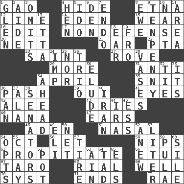 ACROSS 1. E Mali city 4. Flintstone garb 8. Inactive volcano in Sicily 12. Welles in "The Third Man" 14. Genesis locale 15. Put on (as clothing) 16. Prepare for publication 17. Unrelated to defense, as in spending 20. Remaining after all deductions 21. Boat paddle 22. Parent Teacher Association (abbr.) 23. Inhabitant of Heaven 27. Be footloose 29. Greater amount 31. Against 34. Showery time 35. In a ____ (agitated or irritated) 36. Romantic infatuation 39. Fr. "Yes" 41. Sight organs 42. Toward shelter 43. Frees from moisture 46. Nanny 47. Hearing organs 48. An important port of Yemen 51. Rhinal 54. Sep. follower 56. Allow 58. Pinches, bites 61. Appease 66. Needle holder 67. Edible starchy tuberous root 68. Monetary unit of Yemen 69. Not ill 70. System (abbr.) 71. Extremities 72. Actress Charlotte DOWN 1. Small, secluded valley 2. Assistant 3. Leaves out 4. Layer 5. Wedding promise 6. Lair 7. Inside; within (prefix) 8. She-sheep 9. 3-inch nail 10. Political cartoonist Thomas 11. Type of rug 13. Singer James 18. Ewer handle 19. From 24. Mischievous child 25. Not either 26. Musical group of three 28. Flower holders 30. Evade 32. Standoff 33. ___ a Wonderful Life 34. At or in the front 36. Baking dish 37. According to 38. Elected representatives 40. SW Asia republic 44. Retirement account (abbr.) 45. Curvy letter 49. Biblical high priest 50. Fish or hair follower 52. Afresh 53. 61 cubic inches 54. Elects 55. Supercomputer manufacturer 57. Become fatigued 59. Monetary unit of Botswana 60. Drop; flow; fall 62. Cooking vessel 63. The 18th letter of the Arabic alphabet 64. Small amount or degree 65. Raised railways
