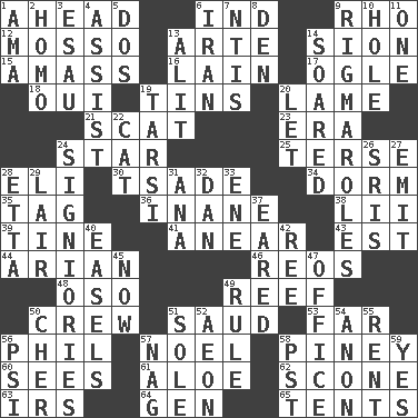 ACROSS 1. Having the leading position 6. Indiana (abbr.) 9. 17th letter of the Greek alphabet 12. With motion or animation 13. Johnson of "Laugh-In" 14. The Jewish people; Israel 15. Collect or gather 16. (Had) reclined 17. Stare at amorously 18. Fr. "Yes" 19. Metal containers 20. Unable to walk 21. Scram! 23. Period 24. Play the lead 25. Laconic 28. Connecticut Ivy Leaguer 30. Sadhe (variant) 34. Dormintory (informal) 35. Label 36. Empty; void 38. Cards in a Roman deck? 39. Prong on a fork 41. Approach 43. Eastern Standard Time (abbr.) 44. Believer in; advocate of (suffix) 46. Vintage cars 48. Bear (Spanish) 49. Coral ridge 50. Ship's personnel 51. Saudi Arabian king (1953-1964) 53. Distant 56. Silvers or Donahue 57. Christmas carol 58. Abounding in pines 60. Perceives with the eye 61. _ vera 62. Biscuitlike quick bread 63. Big collection agency 64. Commissioned military rank (abbr.) 65. Portable shelters DOWN 1. Nursemaid (var.) 2. Like (prefix) 3. Son of Isaac 4. Aid 5. Two (Sp.) 6. SW Asia republic 7. Nuclear Threat Initiatives 8. Lair 9. Complicated, petty procedures 10. Hollow 11. Single 13. Set down 14. Flew 19. Tarsus (plural) 20. Allow 22. Feline 24. Seigniories (variant) 26. Indian titles of respect 27. Send forth 28. Singer James 29. Den 31. Santa ___, CA 32. Daniel's nick name 33. Compass dir. 37. Having ears or earlike features 40. Artist's stands 42. To separate or throw off 45. At this time 47. Position of authority 49. Court order 50. "Mermaids" star 51. Flatfish 52. Period of immesurable duration 54. Soon (poet.) 55. Monthly bill 56. 23rd letter of the Greek alphabet 57. Tired old horse 58. Pacific Standard Time (abbr.) 59. Consenting reply