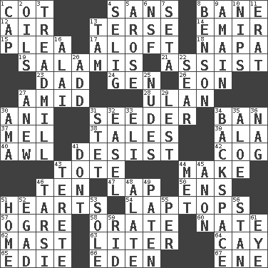 ACROSS 1. Small bed 4. Without 8. Object of repulsion 12. Atmosphere 13. Laconic 14. Independent ruler or chieftain 15. Entreaty 17. Upward 18. California wine valley 19. Deli grouping 21. Aid 23. Male parent 24. Commissioned military rank (abbr.) 26. Period of immesurable duration 27. Among 28. ____ Bator 30. Black tropical American cuckoo 31. Sowing specialist 34. Forbid 37. Cartoonist voice _ Blanc 38. Lies 39. Wing 40. Leather borer 41. Cease 42. Gear tooth 43. Lug 44. Cause to be 46. Nine, plus one 47. Pet locale 50. Followers of ems 51. Centers 54. Portable computers 57. Legendary monster 58. Declaim 60. Nathan's nickname 62. Vertical spar for supporting sails 63. 61 cubic inches 64. Island 65. Singer Brickell 66. Paradise 67. Compass dir. DOWN 1. Head covering 2. Lubricates 3. Excercise machine 4. Former Milwaukee Brewers owner Bud 5. Came up 6. Science/research agcy. 7. Stalk of a moss capsule 8. Gillaume's butler role 9. With great haste 10. Cuts off 11. Part of Q.E.F. 13. Scottish cap 16. Jai ____ 20. Find the sum of 22. Wither 25. Unadorned figures 27. Afresh 29. For fear that 30. Nursemaid (var.) 31. Proofreading order 32. Artist's stand 33. Connecticut Ivy Leaguer 34. Keyboard key 35. Medicinal plant 36. Tired old horse 41. Do not 43. Cigar-shaped 44. Was introduced to 45. Soon (poet.) 46. Tarsus (plural) 48. Having winglike extensions 49. Eucharist need 51. Dwelling 52. Mild oath 53. Not divided or shared with others 55. For each 56. Comedian Laurel of Laurel & Hardy 59. To free from 61. Sight organ