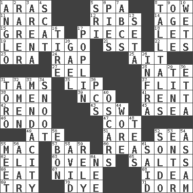 ACROSS 1. Ancient river in northeast Turkey 5. Health resort 8. Pull behind 11. Drug cop 12. Chest bones 14. Grow older 15. Relatively large 17. Part 18. Allow 19. Small, flat, pigmented spot on the skin 21. Fast jet (abbr.) 22. French article 23. Mouth or opening 24. Reproach for some lapse or misdeed 25. Small island 27. Snakelike fish 28. Nathan's nickname 31. Scottish caps 35. Mouth edge 37. Secret move to avoid paying debts 38. Sign of something about to happen 39. Non-commissioned officer (abbr.) 41. Monthly bill 42. Western Nevada city 43. Compass dir. 45. Toward the sea 46. Southwest Nigerian state 47. Small bed 49. Had dinner 51. "We ___ not amused" (Victoria) 52. Ocean 55. Big _ 57. Tavern 60. Thinks logically 62. Connecticut Ivy Leaguer 63. Baking chambers 65. Table seasonings 66. Consume 67. "Death on the ____" 68. The main thing one is thinking about 69. Attempt 70. Color 71. Dormintory (informal) DOWN 1. White American of non-Hispanic descent 2. More valued for its uncommonness 3. Sports stadium 4. Scram, to a cat 5. Indian title of respect (Mr.) 6. Sliced desserts 7. Lettered men learn these first 8. Baron Munchausen's specialties 9. Double curve, resembling the letter S 10. Soaks 13. Stalk of a moss capsule 16. Hoop that covers a wheel 17. Cotton for raincoats, e.g. 20. Highlander 26. Kind of red light 29. Prong on a fork 30. Singer James 31. "Corrida" creature 32. So be it 33. Ananias' fault 34. Snob 36. Personal Computers (abbr.) 40. Motion picture awards 44. Had on 48. Beverages made from leaves 50. Inky black, to poets 52. Twentieth part of a lira 53. Keyboard key 54. Indian state 55. Rendezvous 56. Having or resembling wings 58. Enthusiastic 59. Depend 61. Alleged 64. Born