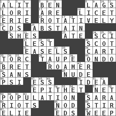 ACROSS 1. Set down 5. Benjamin's nick name 8. Falls behind 12. Australian parrot (variant) 13. "We ___ not amused" (Victoria) 14. It is permitted: Lat. 15. 4th largest of the Great Lakes 16. Producing rotation 19. Music discs 20. Choose not to consume 21. "______ My Girl" (Turtles hit) 23. Had dinner 24. _-fi 27. For fear that 30. Native of Scotland 31. Artist's stands 34. Haul 35. Torque (variant) 38. Grayish beige 40. Southwest Nigerian state 41. Cy Young winner Saberhagen 42. Wanderer 44. Without 45. Unadorned 46. 23rd letter of the Greek alphabet 47. Double-curved letter 50. The main thing one is thinking about 53. Curse 57. Fish or hair follower 59. Census information 63. "Two Mules for Sister ____" 64. Disturbances 65. Lower and raise head in agreement 66. Commotion 67. Writer Wiesel 68. Begley and Asner 69. Shed a tear DOWN 1. Actor Baldwin 2. Domineers 3. From or relating to Ireland 4. Make a knot 5. Sharp remark 6. Greek god of love 7. Remaining after all deductions 8. 54 in ancient Rome 9. Adept person 10. Set 11. Filthy place 14. Actor's bit 17. Auto club (abbr.) 18. Teat (slang) 20. At sea 22. Chooses 24. Glance over 25. Drawstring 26. "Tell ____ the Marines!" 28. Fast jet (abbr.) 29. Pull into pieces 30. Tallied 32. Nilotic language 33. Connect, as a bridge 35. Cook's measure (abbr.) 36. Mouths or openings 37. Painter Guido (1575-1642) 39. Australian flightless bird 43. Prepare for publication 47. Snakelike fish 48. Health resort 49. Be seated 51. Maternal 52. Nest on high 54. Prong on a fork 55. Parka part 56. Extremities 58. Canvas cover 59. Before (prefix) 60. Petroleum 61. Luau course 62. Shoshoni 63. Compass dir.