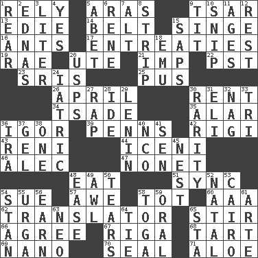 ACROSS 1. Have confidence or faith in 5. Caspian sea tributary 9. Russian ruler of old 13. Singer Brickell 14. Waist strap 15. Scorch 16. Pismires 17. Pleas 19. Actress Charlotte 20. Shoshoni 21. Naughty child 22. Pacific Standard Time (abbr.) 23. Indian titles of respect 25. Tenth month of the Hindu calendar 26. Showery time 30. Monthly bill 34. Sadhe (variant) 35. Having or resembling wings 36. Composer Stravinsky 39. Actor Sean's family 42. Swiss mountan, "Queen of the Mountains" 43. Painter Guido (1575-1642) 44. Ancient Celtic tribe of eastern Britain 46. Actor Baldwin 47. Music written for nine 48. Ingest 51. Synchronize (abbr.) 54. Institute legal proceedings 57. Deep reverence 58. Small child 60. American Automobile Association (abbr.) 62. Interpreter 65. Disorderly outburst 66. Match 67. Capital of Latvia 68. Small pie 69. Billionth: prefix 70. Lick closed 71. _ vera DOWN 1. Tail end 2. Ferber et al. 3. 61 cubic inches 4. It is so 5. Collude with 6. French philosopher Descartes 7. The first octave above the treble staff 8. Empty completely 9. Teat (slang) 10. Clip 11. Ripens 12. Respite 15. Plant excrements 18. Australian flightless bird 20. United States Postal Service (abbr.) 24. Of or pertaining to medicine 27. Hit sharply and swiftly 28. Binary compound 29. Soviet premier 1918-24 30. Noteworthy scarcity 31. Biblical high priest 32. Tired old horse 33. Three (prefix) 36. Retirement account (abbr.) 37. Set 38. Single 40. Non-commissioned officer (abbr.) 41. Elected rep. 45. Egg locale 48. Comfort 49. Leather borer 50. Pulls into pieces 52. Relating to or accompanying birth 53. Capital of Egypt 54. Comedian Laurel of Laurel & Hardy 55. Capital and largest city of Mongolia 56. Merit 58. Ancient Roman robe 59. Relating to the mouth 61. Johnson of "Laugh-In" 63. Modern: prefix 64. Standoff 65. R.R. building