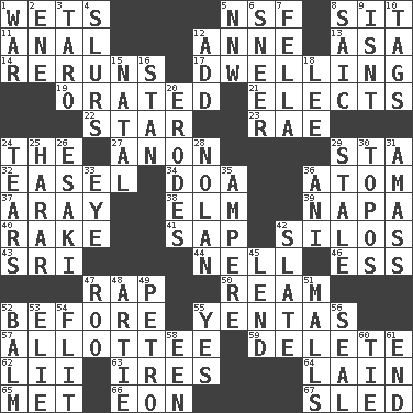 ACROSS 1. Moistens 5. Science/research agcy. 8. Be seated 11. Of or related to the anus 12. Singer Murray 13. White ___ sheet 14. Summer TV shows 17. Home 19. Spoke pompously 21. Chooses 22. Play the lead 23. Actress Charlotte 24. Definite Article 27. At once, immediately (arch.) 29. R.R. building 32. Artist's stand 34. ___ good deed 36. Smallest unit of an element 37. Like ___ of sunshine 38. Shade tree 39. California wine valley 40. Libertine 41. Plant excrement 42. Grain storage towers 43. _ Lanka 44. 1994 drama film starring Jodie Foster 46. Double-curved letter 47. Reproach for some lapse or misdeed 50. 480, 500 or 516 sheets of paper 52. Prior to 55. Gossips 57. One to whom something is allotted 59. Keyboard key 62. Cards in a Roman deck? 63. Angers 64. (Had) reclined 65. Was introduced to 66. Age 67. Downhill vehicle DOWN 1. Armed conflict 2. Compass dir. 3. Pacific island yam 4. Disparaging remarks 5. Compass dir. 6. Contemptuous expression 7. Chap (slang) 8. Ketch in the Levant 9. Is not 10. Labels 12. Increase 15. Relating to or accompanying birth 16. Comedian Laurel of Laurel & Hardy 18. Area sheltered from the wind 20. Eats (away) 24. Separates forcefully 25. Ethiopian city, capital of Harari 26. 1973 Nobel Price Winner (Physics) Leo 28. Pitcher Ryan 29. Showing deterioration from age 30. Literary convention 31. Collect or gather 33. Sight organ 35. Electrical Unit 36. Black tropical American cuckoo 42. Schedule 45. Grant temporary use of 47. Friend of Pooh 48. Nick name for Arthur 49. Stone: prefix 51. Shopping centers 52. Lip ointment 53. Writer Wiesel 54. Secret move to avoid paying debts 55. Affirmative reply 56. Lick closed 58. Car or cant ending 60. Neckwear 61. Conclusion