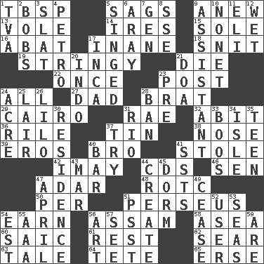 ACROSS 1. Cook's measure (abbr.) 5. Droops 9. Afresh 13. Short-tailed, large-bodied rat 14. Angers 15. Flatfish 16. Blind as ____ 17. Lacking in sense or substance 18. In a ____ (agitated or irritated) 19. Slender, wiry 21. Pass on 22. At one time in the past 23. Mail 24. 100% 27. Male parent 28. Naughty child 29. Capital of Egypt 31. Actress Charlotte 32. "This won't hurt ____!" 36. Cause heat under the collar 37. Shallow baking pan 38. Characteristic smell of wine 39. Greek god of love 40. Sis' sibling 41. Took without asking 42. "If ____ say so..." 44. Music discs 46. Elected rep. 47. The sixth month of the Jewish calendar 48. College mil. group 50. For each 51. Son of Zeus who helped slay Medusa 54. Merit 56. Indian state 58. Toward the sea 60. Ketch in the Levant 61. Respite 62. Wither 63. Story 64. False hair 65. Celtic language DOWN 1. Federal power corp. 2. Moves up and down 3. Narrow board 4. Stone: prefix 5. Scorched 6. Like ___ of sunshine 7. Commissioned mil. rank 8. Compass dir. 9. Aide 10. Music written for nine 11. Biblical high priest 12. Soggy 17. South American Indian 20. _ china 21. ___ good deed 23. Before (prefix) 24. Measure of real estate 25. Den 26. _ and Stitch 28. Bar 30. Dwelling 31. _ de Janeiro 33. Scornful sounds 34. Small island 35. Adolescent 37. Attempt to accomplish something 40. Oblong piece of solid material 41. Fast planes 43. Make imperfect 44. Make 45. Dormintory (informal) 47. Showery time 49. Stop 51. Inconspicuous attention getter 52. One who makes use of a thing 53. Oceans 54. Eastern Standard Time (abbr.) 55. Auto club (abbr.) 56. Tate display 57. Perceive with the eye 59. "We ___ not amused" (Victoria)