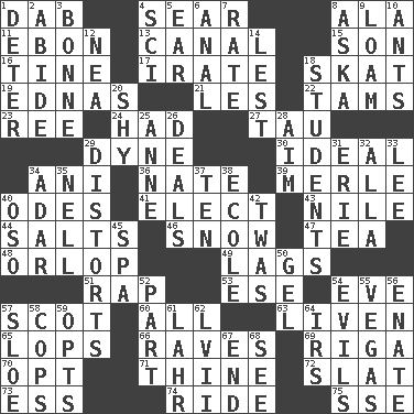 ACROSS 1. Apply (a substance) by light strokes 4. Shrivel 8. Wing 11. Inky black, to poets 13. Lessep's creation 15. Manchild 16. Prong on a fork 17. Feeling or showing extreme anger 18. Three-handed card game 19. Ferber et al. 21. French article 22. Scottish caps 23. To sift 24. Possessed 27. The 19th letter of the Greek alphabet 29. Centimeter-gram-second unit of force 30. Perfect 34. Black tropical American cuckoo 36. Nathan's nickname 39. Haggard of country music 40. Lyric poems 41. Choose 43. "Death on the ____" 44. Table seasonings 46. Overwhelm 47. Beverage made from leaves 48. Fourth or lowest deck 49. Falls behind 51. Strike 53. Compass dir. 54. First lady 57. Native of Scotland 60. 100% 63. Make or become more lively 65. Chops off 66. All-night dance parties 69. Port city in Latvia 70. Elect 71. One or ones belonging to thee 72. Narrow board 73. Curvy letter 74. Travel on or in a vehicle 75. Compass dir. DOWN 1. Prevent from occurring 2. Tolerate 3. Child's nurse 4. _-fi 5. Ewer handle 6. Of or related to the anus 7. Pace 8. "____ silly question..." 9. Rich soil 10. Pismires 12. Teachers' org. 14. For fear that 18. SAT takers 20. Like a shrinking violet 25. Singer Murray 26. Allots cards 28. Direct toward a target or goal 29. What propaganda does 31. One of the Great Lakes 32. Silent film actress Nazimova 33. Area sheltered from the wind 34. The sixth month of the Jewish calendar 35. 1994 drama film starring Jodie Foster 37. Nine, plus one 38. Learning spot: Fr. 40. Bear (Spanish) 42. It was, poetically 45. Health resort 50. Set 52. Component 54. Vices 55. Viva Las _ 56. Maternal 57. _ gin 58. 911 reaches them 59. Chooses 61. Cowardly lion portrayer 62. 57 in ancient Rome 64. Big collection agency 67. Conclude 68. Observe