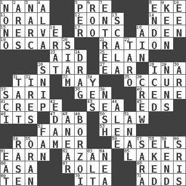 ACROSS 1. Nanny 5. Before (prefix) 8. Supplement with great effort 11. Taken by mouth 12. Immeasurably long periods of time 14. Born 15. Effrontery 17. College mil. group 18. An important port of Yemen 19. Motion picture awards 21. Food allowance for one day 23. Help 25. Flair 26. Play the lead 27. Ewer handle 28. _ tizzy (2 wds.) 31. Shallow baking pan 33. Fifth month 35. Happen 37. Indian skirt 38. Commissioned military rank (abbr.) 40. French philosopher Descartes 41. Streamer paper 43. Ocean 45. Begley and Asner 46. ___ a Wonderful Life 47. Small moist lump or mass 50. Cole _ (cabbage dish) 52. Papal veil 53. Layer 54. Wanderer 56. Artist's stands 61. Merit 62. Muslim summons to prayer 65. Member of a famous L.A. basketball team 66. White ___ sheet 67. Hero or heavy, e.g. 68. Painter Guido (1575-1642) 69. Nine, plus one 70. Call ___ day 71. Does sums DOWN 1. Words to Nanette 2. Ancient Greek god of war 3. Drug cop 4. Inventor's middle name 5. For each 6. Friend of Pooh 7. Main course 8. Inside; within (prefix) 9. Peachy ____! 10. Car or cant ending 13. Any of the three canals of the cochlea 16. Part of Q.E.F. 18. The 18th letter of the Arabic alphabet 20. Thailand, formerly 22. Pacific island yam 24. To trail on the ground 26. Clip 28. On the rocks 29. Religious women 30. "We ___ not amused" (Victoria) 31. Small pie 32. Angers 34. Consenting reply 36. Group working together 37. _-fi 39. Delicate 42. Dutch treat 44. Toward shelter 48. Approach 49. Russian wolfhound 51. Of or related to the anus 52. Air blower 54. Raze (variant) 55. NW Algerian seaport 57. "Two Mules for Sister ____" 58. Supplemented with great effort 59. Grant temporary use of 60. Indian titles of respect 61. Consume 63. Keyboard modifier key 64. Teachers' org.