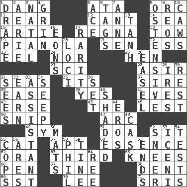 ACROSS 1. Mild oath, euphamism for damn 5. "One Day ___ Time" 8. The grampus (Milton) 11. Posterior 12. Patter 14. Ocean 15. Nick name for Arthur 17. Canadian anthropologist Darnell 18. Pull behind 19. Player piano 21. Elected rep. 22. Double-curved letter 23. Snakelike fish 24. And not 25. Layer 27. _-fi 28. SW Saudi Arabia district 31. Oceans 35. ___ a Wonderful Life 37. Male parent of an animal 38. Relaxation 39. Consenting reply 41. Nights before holidays 42. Celtic language 43. Definite Article 45. For fear that 46. Clip 47. Curve 49. Symbol (abbr.) 51. ___ good deed 52. Be seated 55. Domesticated feline 57. Fitting 60. Center 62. Mouth or opening 63. One of three equal parts 65. Leg joints 66. Writing instrument 67. Trig term 68. Gouge 69. Fast jet (abbr.) 70. Area sheltered from the wind 71. Indian titles of respect DOWN 1. Window treatment 2. Nest on high 3. Relating to or accompanying birth 4. Smile widely 5. Adept person 6. Labels 7. Singer Murray 8. Clearly or manifestly demonstrative 9. Vintage cars 10. Crow sounds 13. Hyperbolic tangent 16. Immeasurably long periods of time 17. Noteworthy scarcity 20. Locales 26. Artist's stand 29. Angers 30. Respite 31. Observes 32. Merit 33. Helper 34. Not well drained, as in land 36. Put into a specified state 40. Cast a shadow over 44. Greek god of love 48. Keg 50. Floor protectors 52. Scornful expression 53. Ancient Celtic tribe of eastern Britain 54. Trials 55. 911 reaches them 56. Ancient Greek god of war 58. Silvers or Donahue 59. Prong on a fork 61. Extremities 64. To sift