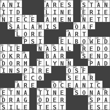 ACROSS 1. Cuckoo 4. Ancient Greek god of war 8. Comedian Laurel of Laurel & Hardy 12. It would 13. Actor's bit 14. One of the Great Lakes 15. Sibling's daughter 18. So be it 19. Remaining after all deductions 20. Deli grouping 22. Clumsy lout 23. Old wives' tales, e.g. 24. Nonscientific branch of learning 25. Air pressure measure (abbr.) 26. Shoved, as through a crowd 30. Whopper 33. Rhinal 36. Make new 37. Gumbo ingredient 39. Soap unit 40. Transmit 41. Dormintory (informal) 42. Film actor Errol 44. Groovy apt. 45. Stimulate to action 47. Order of Saint Francis (abbr.) 50. Environmental prefix 51. Scorch 53. "We ___ not amused" (Victoria) 54. Pertaining to the sea 57. Inactive volcano in Sicily 59. Prong on a fork 61. Echolocation 63. To trail on the ground 64. Baltic tributary 65. Health resort 66. Drop; flow; fall 67. Trial 68. Compass dir. DOWN 1. The 18th letter of the Arabic alphabet 2. Nuclear Threat Initiatives 3. Perfect 4. Jai _ 5. Basketball hoops 6. Compass dir. 7. Elected rep. 8. Elected representatives 9. Not kosher 10. Small island 11. Fish or hair follower 16. Hoof sound 17. Hearing organs 21. Chow _ 22. Globe 24. 100% 26. Merit 27. Shed a tear 28. Pulitzer Prize-winning author Ferber 29. Texas town _ City 30. Farming town in central California 31. Image 32. Blunders 34. Competent 35. Declare 38. Electrical Measurement 42. Away 43. Olfactory organ 46. Frozen water 48. Oceans 49. Papal veil 52. Wash lightly 53. Of or related to the anus 54. Singles 55. Foregone conclusion 56. Smile enhancers 57. Begley and Asner 58. Three (prefix) 59. Small child 60. Binary compound 62. Actress Charlotte