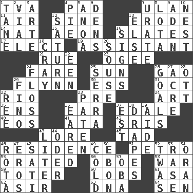 ACROSS 1. Federal power corp. 4. Writing tablet 7. ____ Bator, Mongolia 11. Atmosphere 12. Trig term 13. Eat (away) 14. Floor covering 15. A really long time 16. Chalkboards 17. Voters do this 19. Aide 21. Sorrow 23. Double curve, resembling the letter S 24. Conductor's collection 25. Player for Phoenix 26. E Mali city 29. Film actor Errol 30. Curvy letter 31. Sep. follower 32. _ de Janeiro 33. Before (prefix) 34. Nonscientific branch of learning 35. Followers of ems 36. Hearing organ 37. Peak District village in England 40. Greek goddess of the dawn 41. "One Day ___ Time" 42. Indian titles of respect 43. Old wives' tales, e.g. 45. Bit 46. Home 51. Stone: prefix 55. Spoke pompously 56. Mitch Miller's instrument 58. Armed conflict 59. Carrier 60. Tennis shots 61. White ___ sheet 62. SW Saudi Arabia district 63. Heredity factor (abbr.) 64. Elected rep. DOWN 1. Docile 2. Small bottle 3. Johnson of "Laugh-In" 4. Sliced dessert 5. Small Philippine buffalo 6. Habitations of wild animals 7. A salt of uric acid 8. Globular water bottle used in Asia 9. An important port of Yemen 10. A home for chicks 12. Titan orbits this 13. Otherwise 16. Attaches a signature 18. Supercomputer manufacturer 20. Lush 22. Car or cant ending 24. Soft thread for cleaning between teeth 25. Spanish missionary in California 26. Finish lines 27. 43,560 square feet 28. Baseball player Mel 29. Fine (Spanish) 32. Portuguese money of account (variant) 33. Eucharist need 36. Having ears or earlike features 37. Eastern Standard Time (abbr.) 38. Window treatments 39. Assistant 43. 61 cubic inches 44. River in Europe 46. Roll call or roster of names 47. Greek god of love 48. Suttee (variant) 49. Lacking warmth 50. Inky black, to poets 52. It was, poetically 53. Raze (variant) 54. NW Algerian seaport 57. Chief or king in Benin or Nigeria