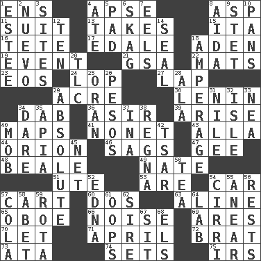 ACROSS 1. Followers of ems 4. Domed church section 8. Viper 11. Costume for a special activity 13. Receives possession of 15. Call ___ day 16. Wig 17. Peak District village in England 18. Arabian gulf 19. Happening 21. Girls' org. (abbr.) 22. Floor protectors 23. Greek goddess of the dawn 24. Trim (branches) 27. Infant locale 29. 43,560 square feet 30. Soviet premier 1918-24 34. Pat or tap gently 36. SW Saudi Arabia district 39. Ascend 40. Atlas contents 41. Music written for nine 43. Silent film actress Nazimova 44. Constellation of myth 46. Droops 47. Unit of force equal to gravity 48. Calif. Air Force Base 49. Nathan's nickname 51. Shoshoni 53. "We ___ not amused" (Victoria) 54. Auto 57. Draw slowly or heavily 60. Two (Sp.) 63. Place in a line 65. Mitch Miller's instrument 66. Annoying sound 69. Ancient Greek god of war 70. Allow 71. Showery time 72. Naughty child 73. _ moment's notice (2 wds.) 74. Arranges properly for use 75. Big collection agency DOWN 1. First name in cosmetics 2. New (sp.) 3. Locates 4. Had dinner 5. Groovy apt. 6. Heroin 7. Snakelike fish 8. Opera by Verdi 9. Proofreading order 10. Zero-star reviews 12. "___ Little Indians" 14. Lick closed 18. Electrical Measurement 20. Affectionate concern, for short 25. NW Algerian seaport 26. Mexican monetary units 28. Insect wing 29. Utter; complete 31. "Death on the ____" 32. Capri or Wright 33. Teachers' org. 34. Have the gumption 35. Capital of Western Samoa 37. _ tizzy (2 wds.) 38. Rain (Swedish) 40. Crowd into 42. Russian ruler of old 45. Fish or hair follower 50. Afternoon social gathering 52. Pulitzer Prize-winning author Ferber 54. High-altitude cloud 55. Approach 56. Musical pauses 57. Root beer relative 58. Collude with 59. Round or rotation of duties 61. I made a mistake 62. Father 64. Experiment locale 67. Be seated 68. Raised railways